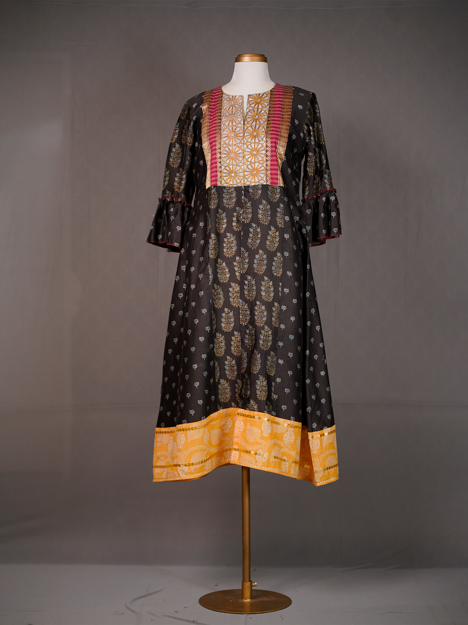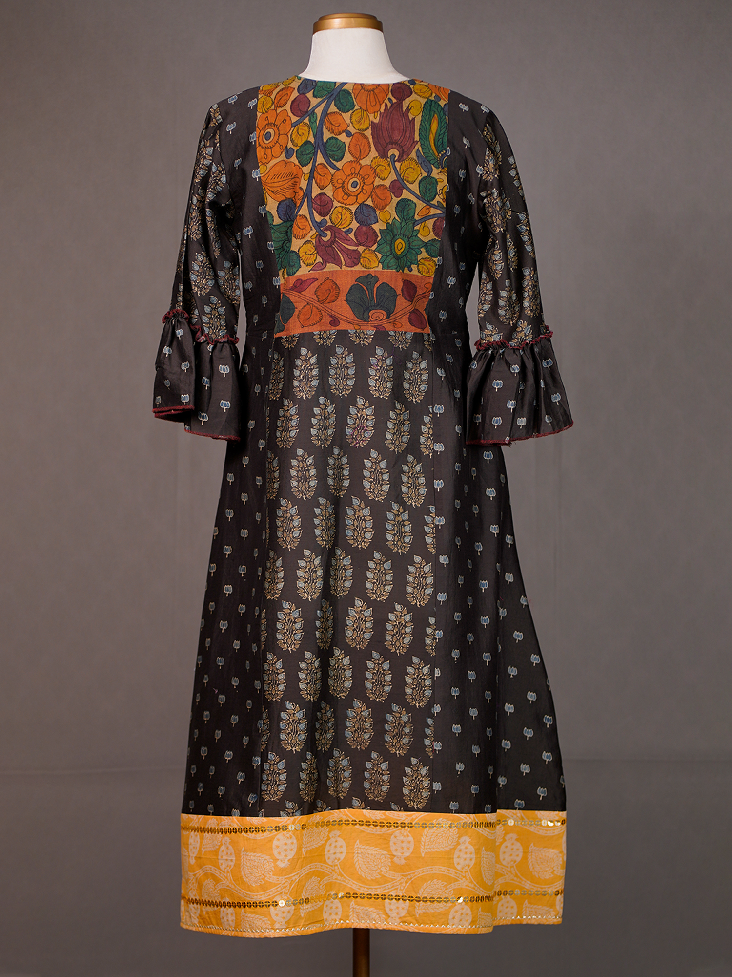 Black Chanderi Kurti with Ajrakh Print Panel and Thread Work Yoke