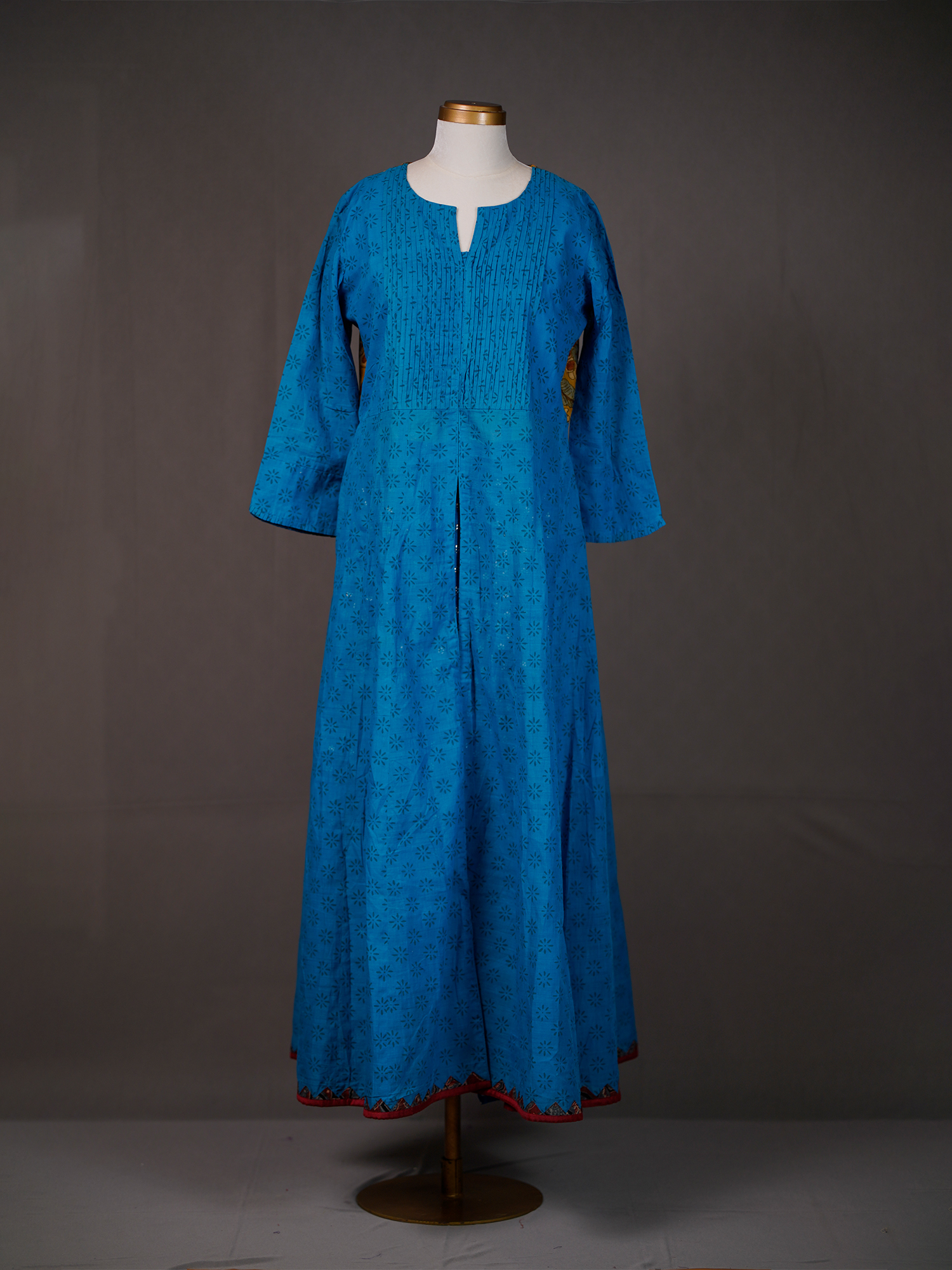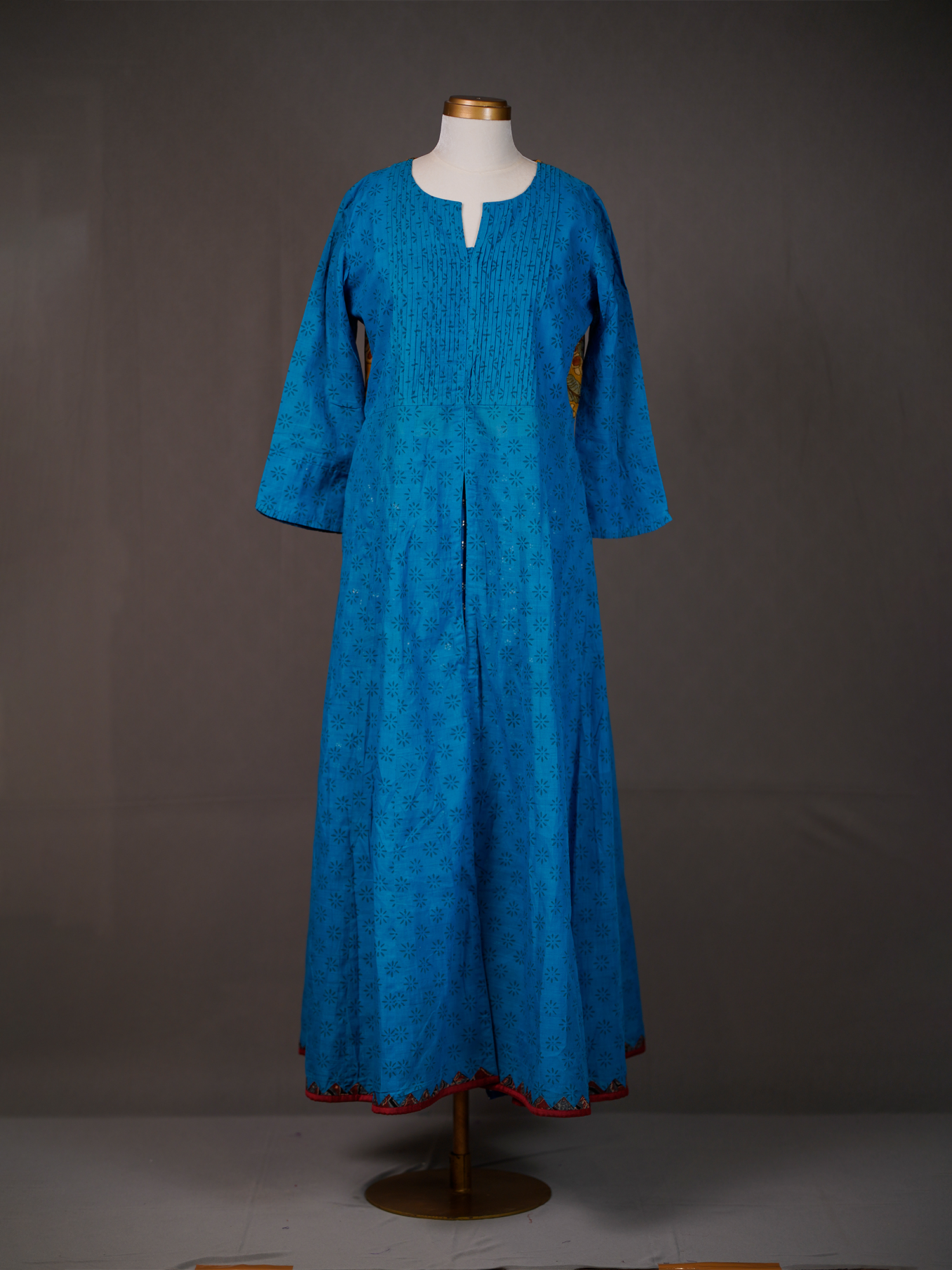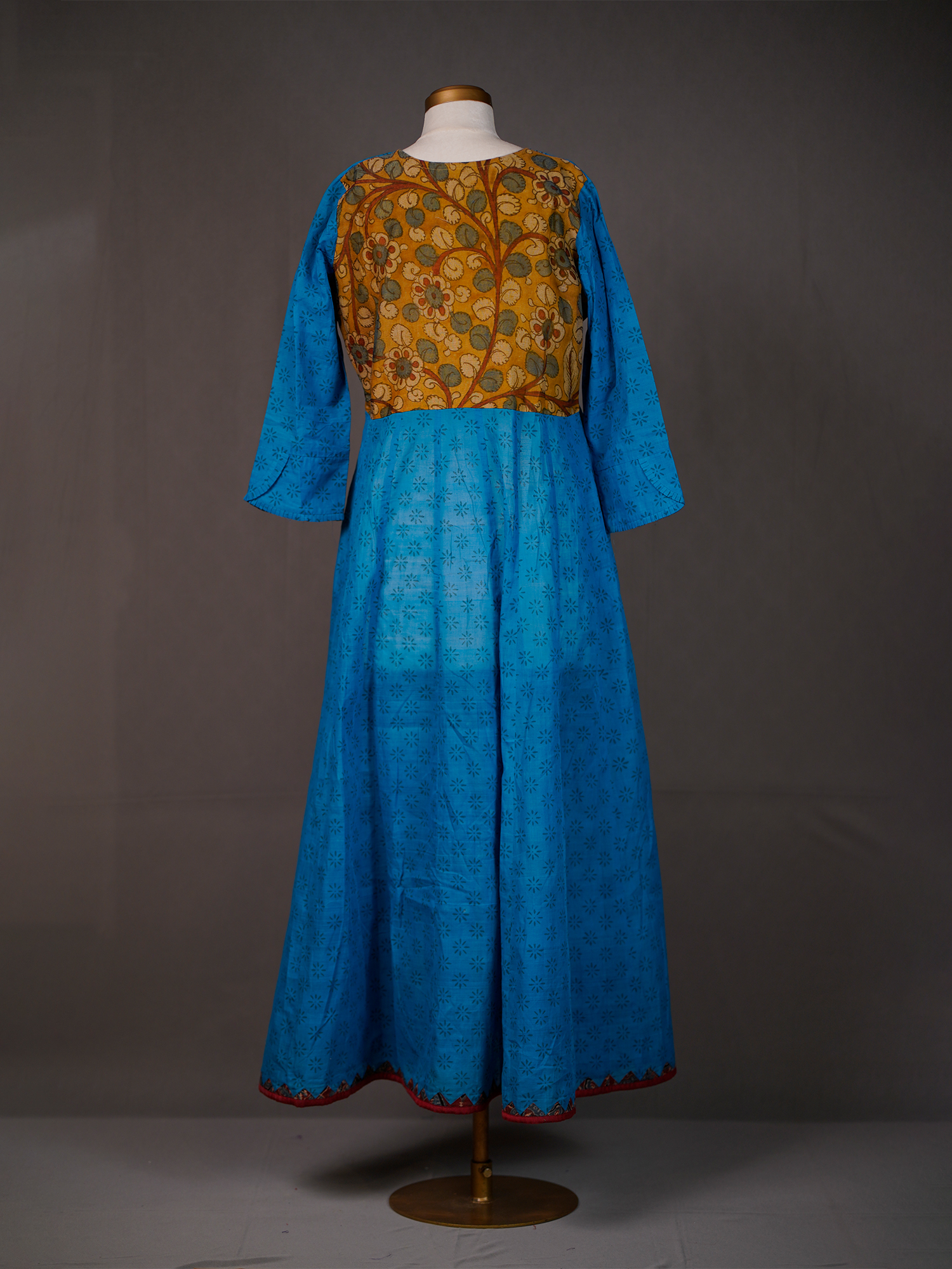Blue Cotton Printed Long Kurti with Slit, Kalamkari Patch on Back