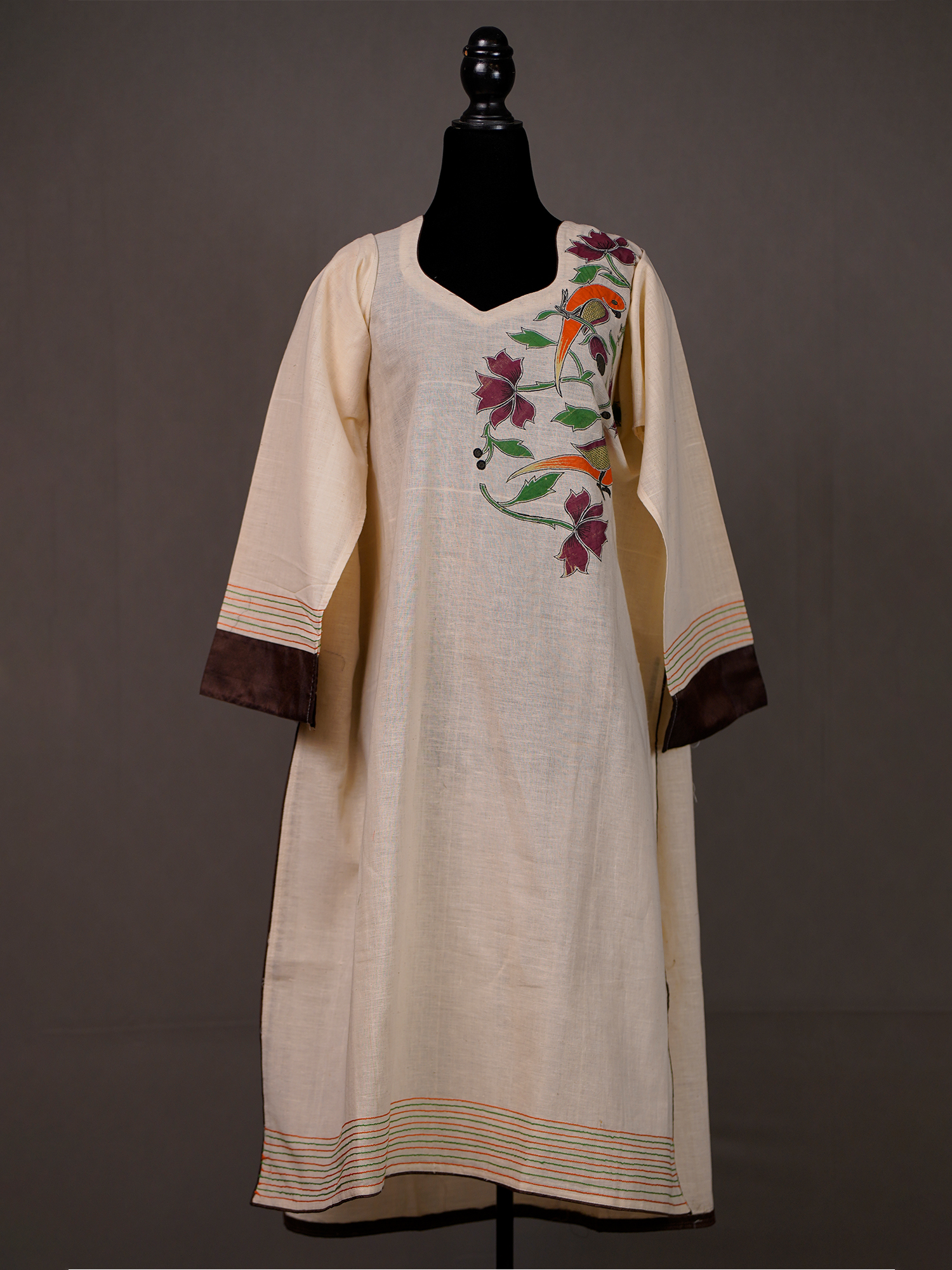 Cream Handwoven Cotton Unstitched Kurti With Floral Applique Work | Mamatha Tulluri