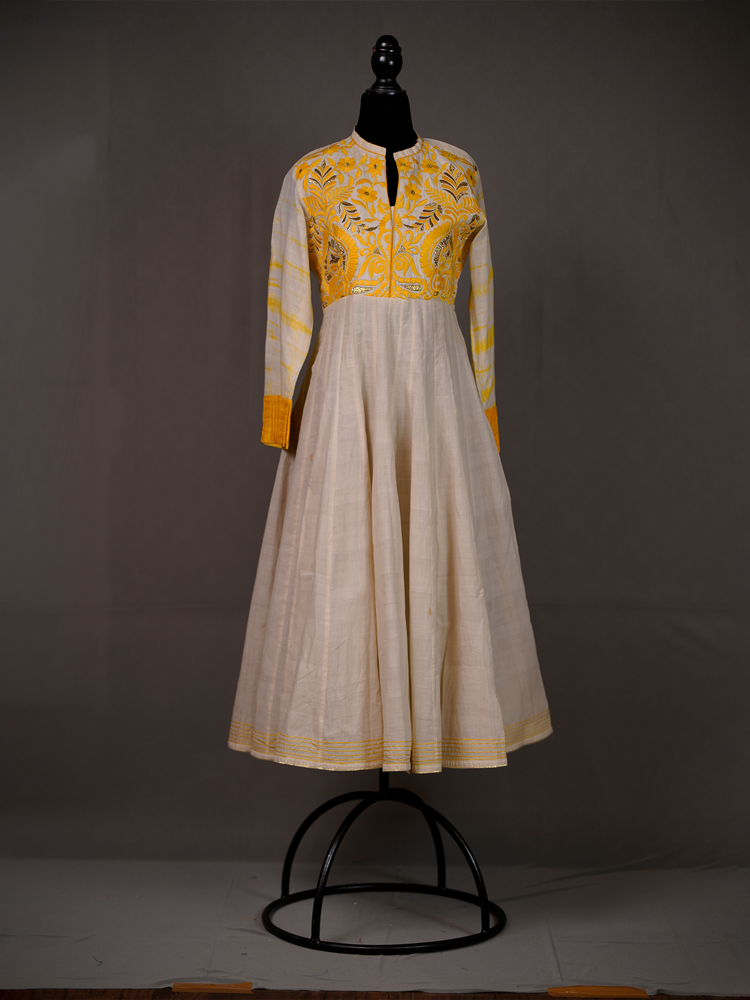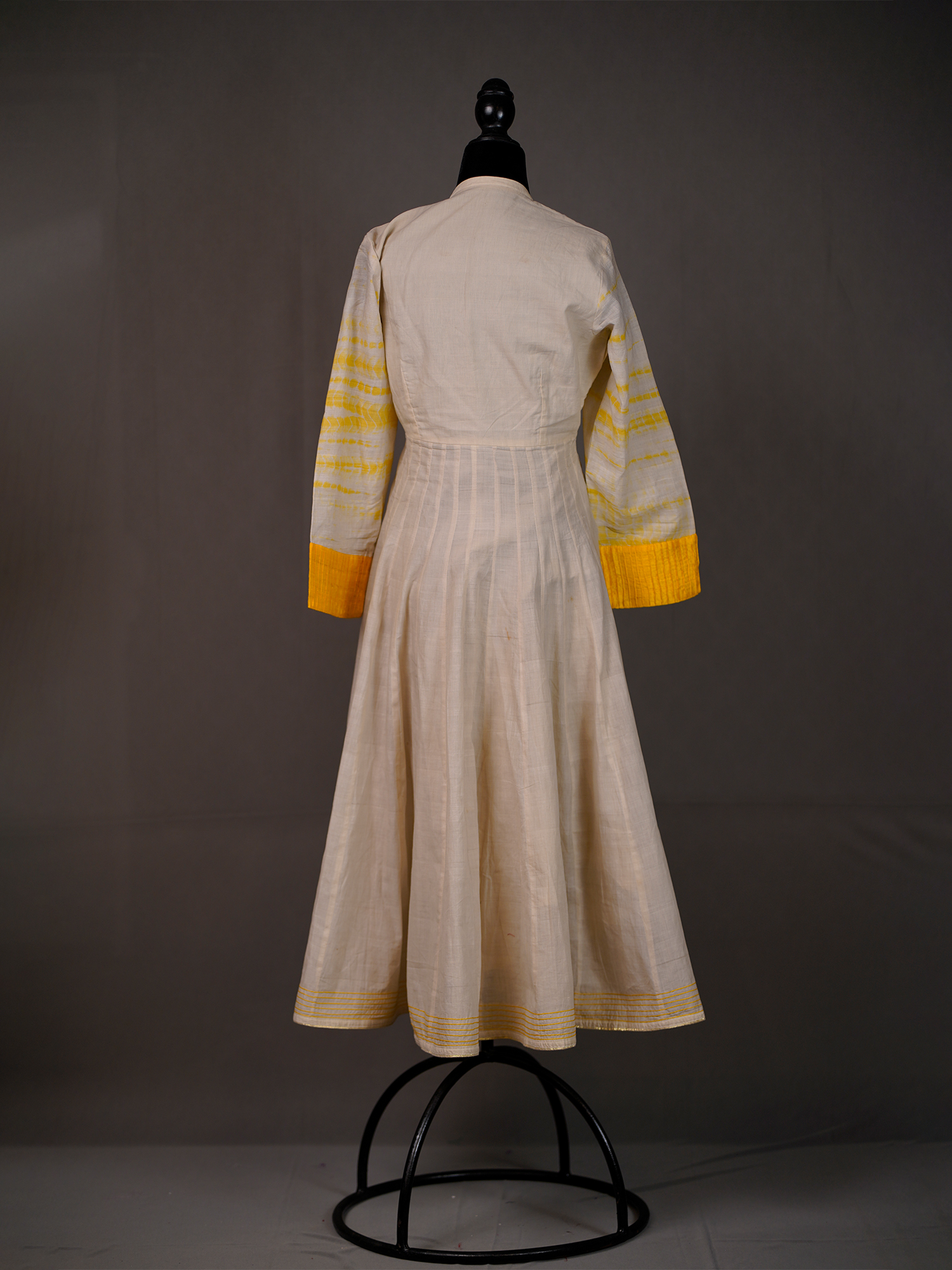 Cream Kali Long Kurti with Yellow Thread Work, Tie-n-Dye Sleeves
