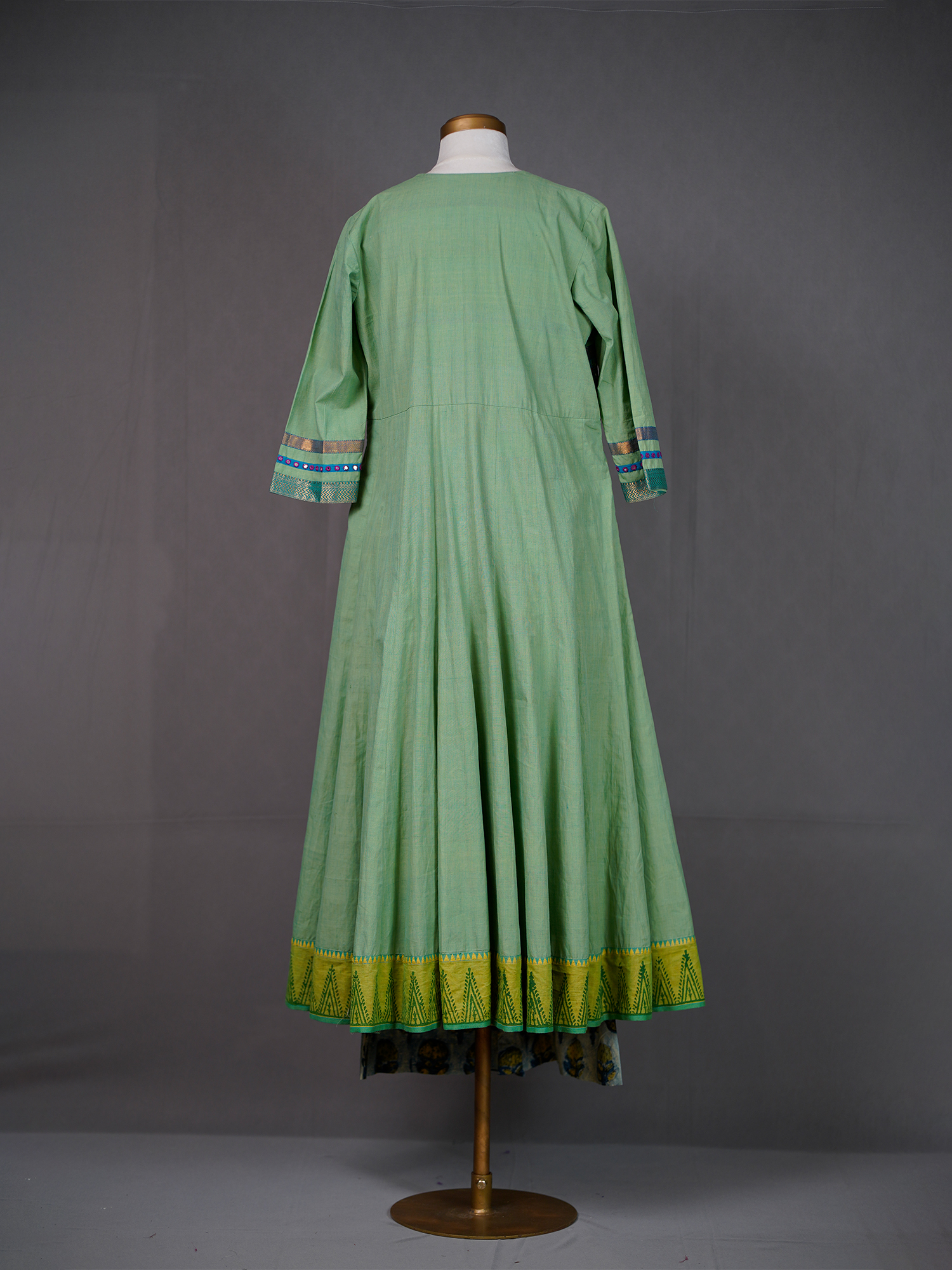 Green Kali Kurti with Kutch work, Mirrors, Front Slit, Printed Pants