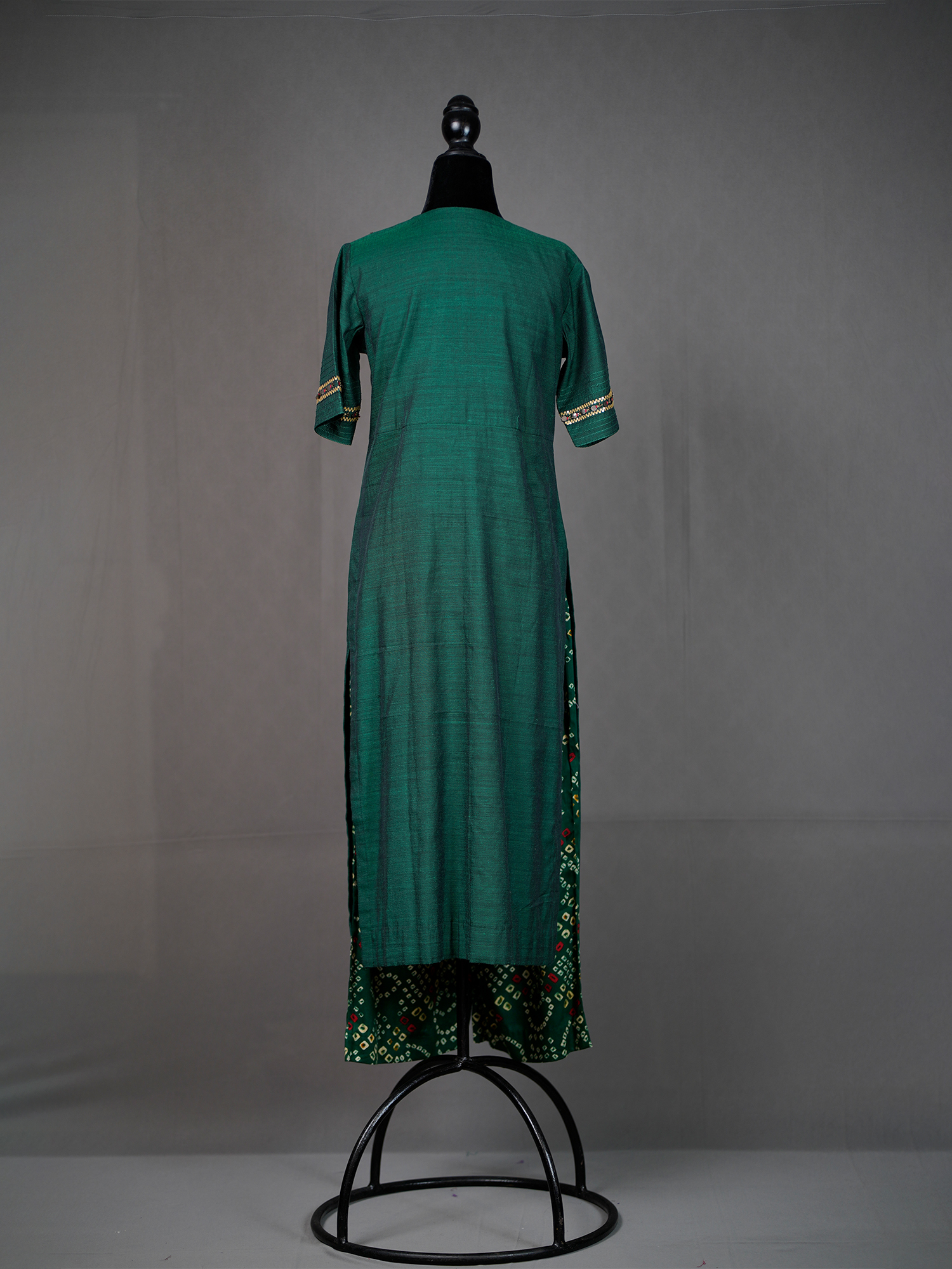 Green Kurti with Rich Sequinned Deep V Neck and Bandhni Pants