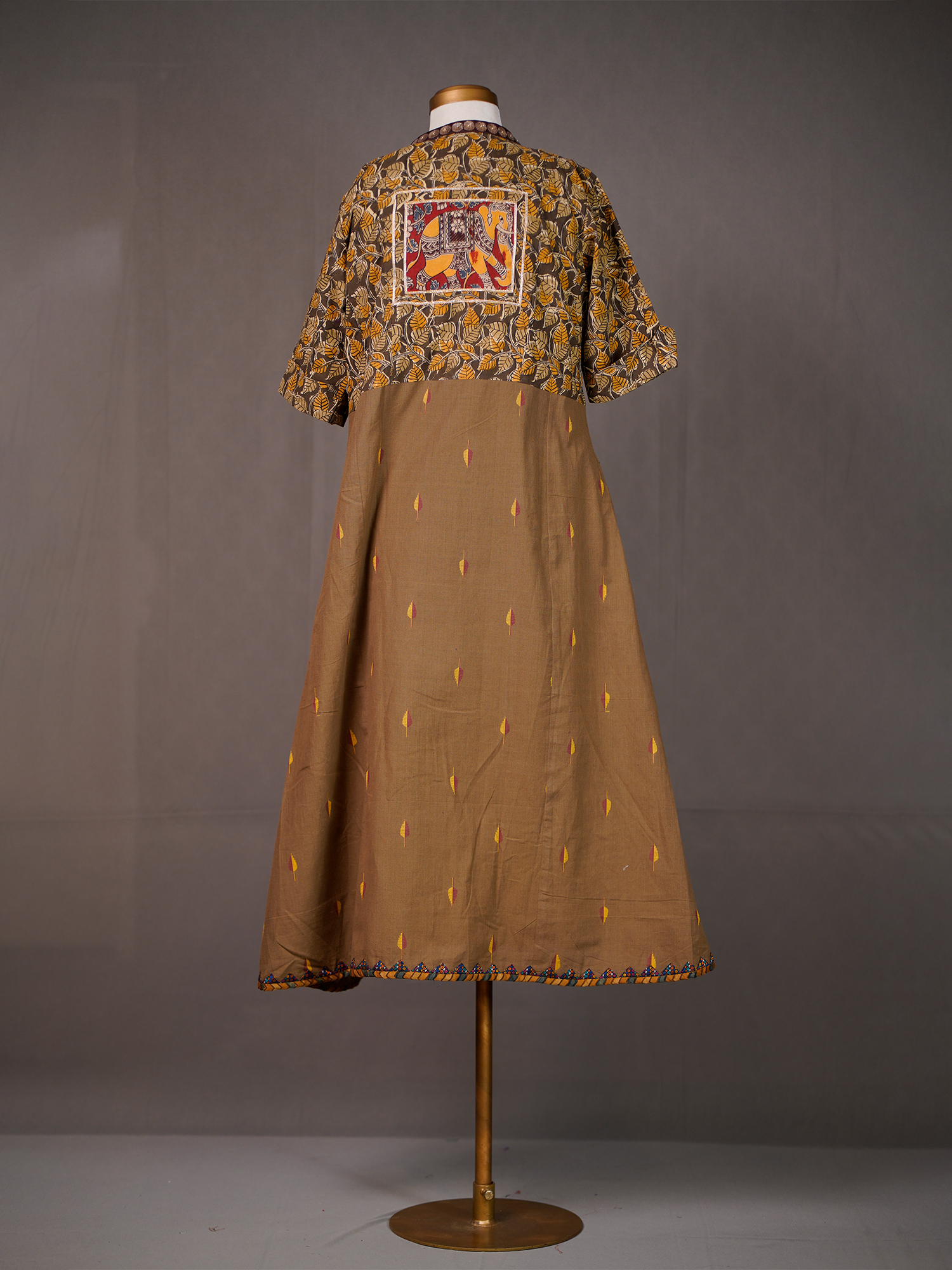 Green Sleeveless Cotton Handwoven A-Line Kurti With Kalamkari Koti