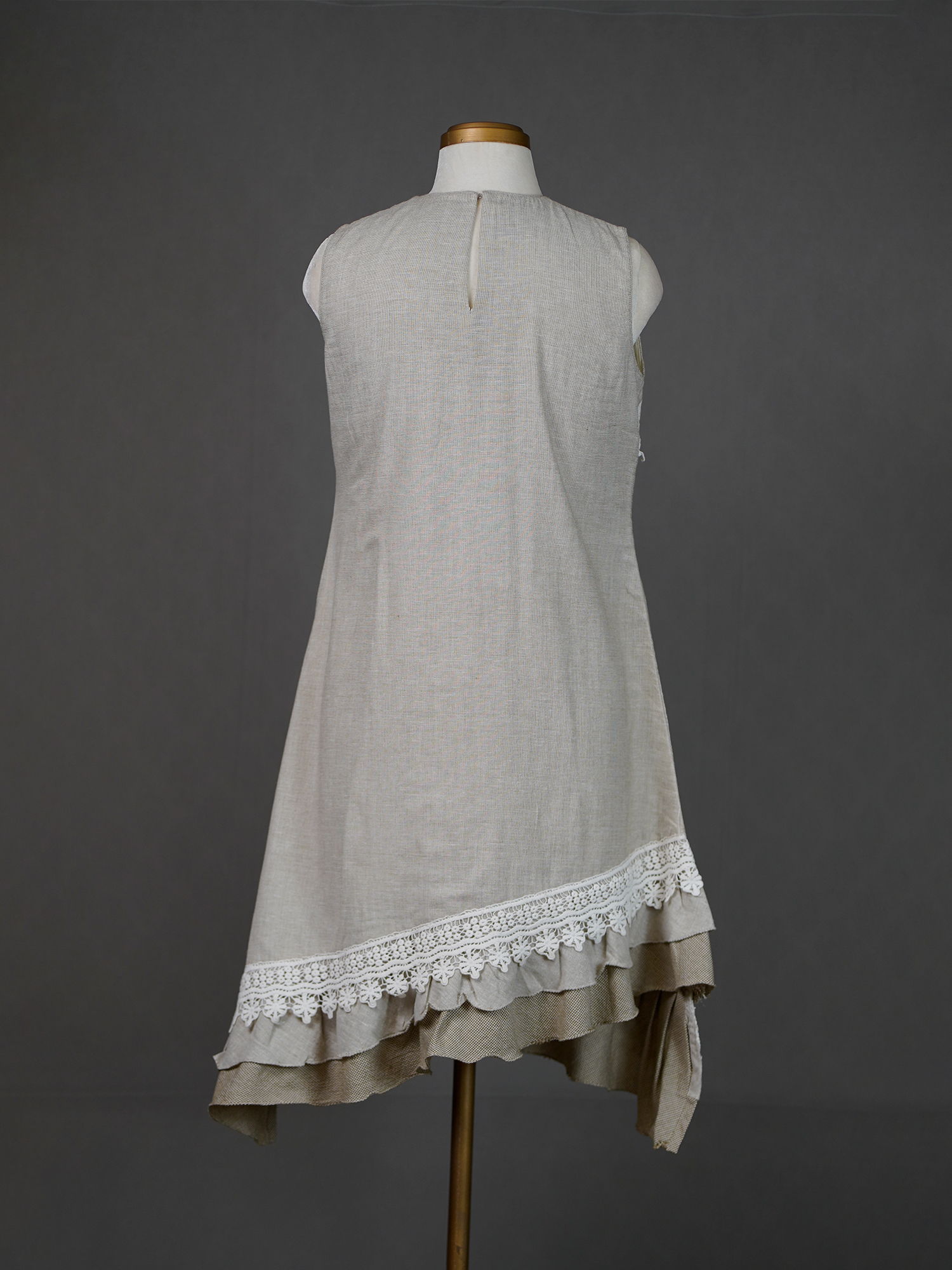 Grey Sleeveless Asymmetrical Dress with Applique Motif and Crochet Lace
