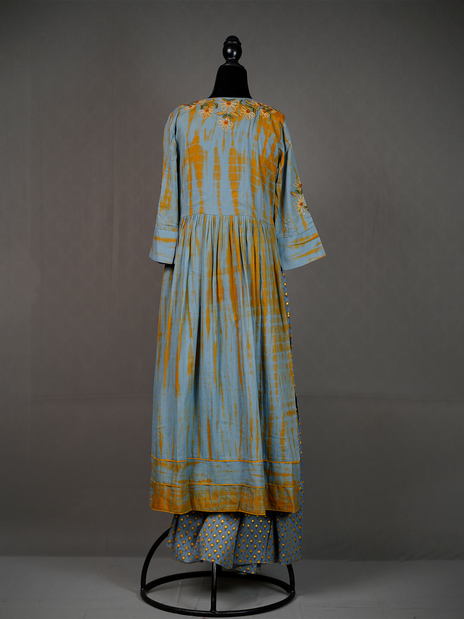 • Yellow Shaded Anarkali Kurti with Mirror Embroidery and Pants