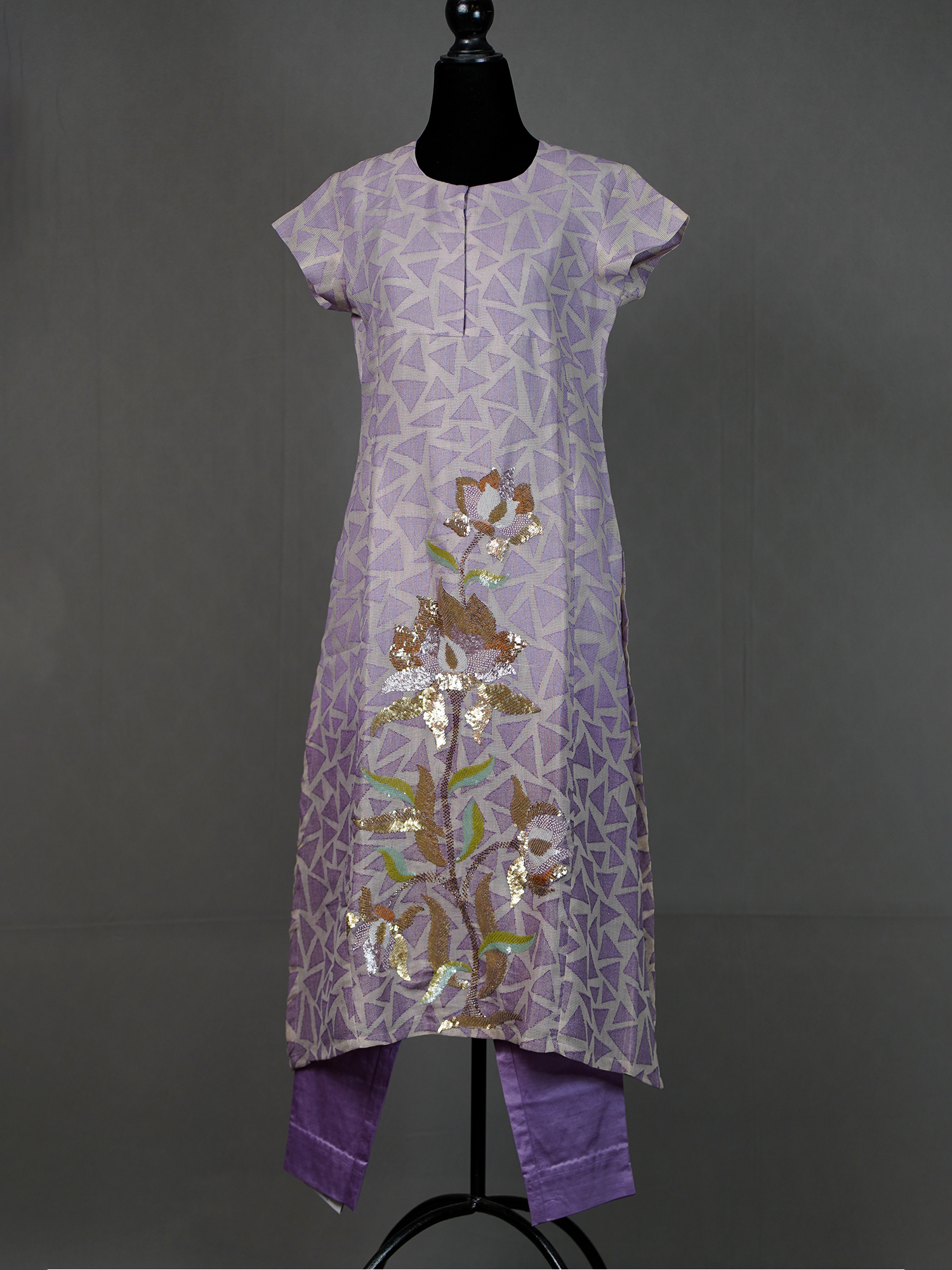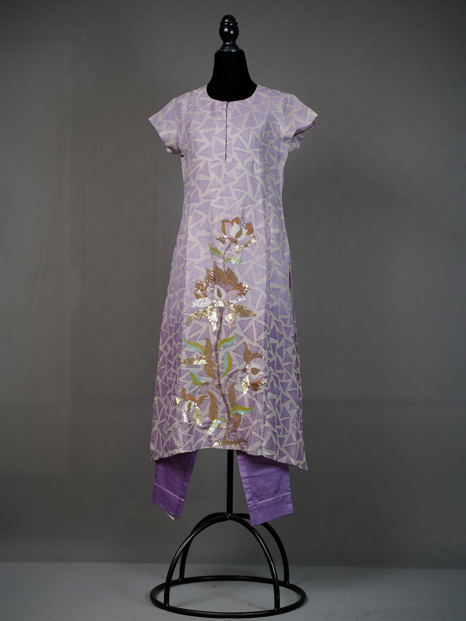 Lavender Handwoven D-Cut Kurti with Stylish Sequins Work and Pants | Mamatha Tulluri