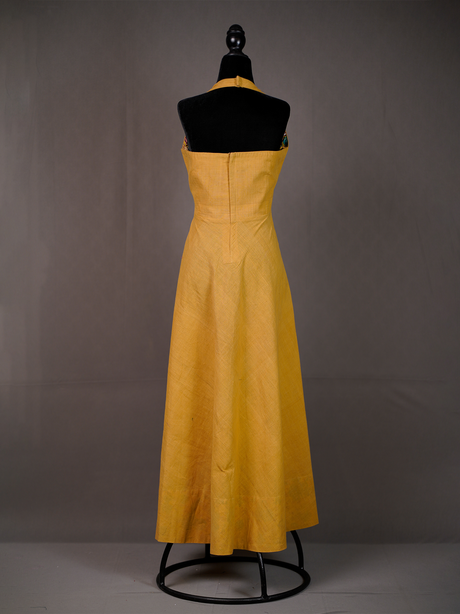 Mustard Handwoven Cotton Plain Floor Length Dress with Halter Neck | Mamatha Tulluri