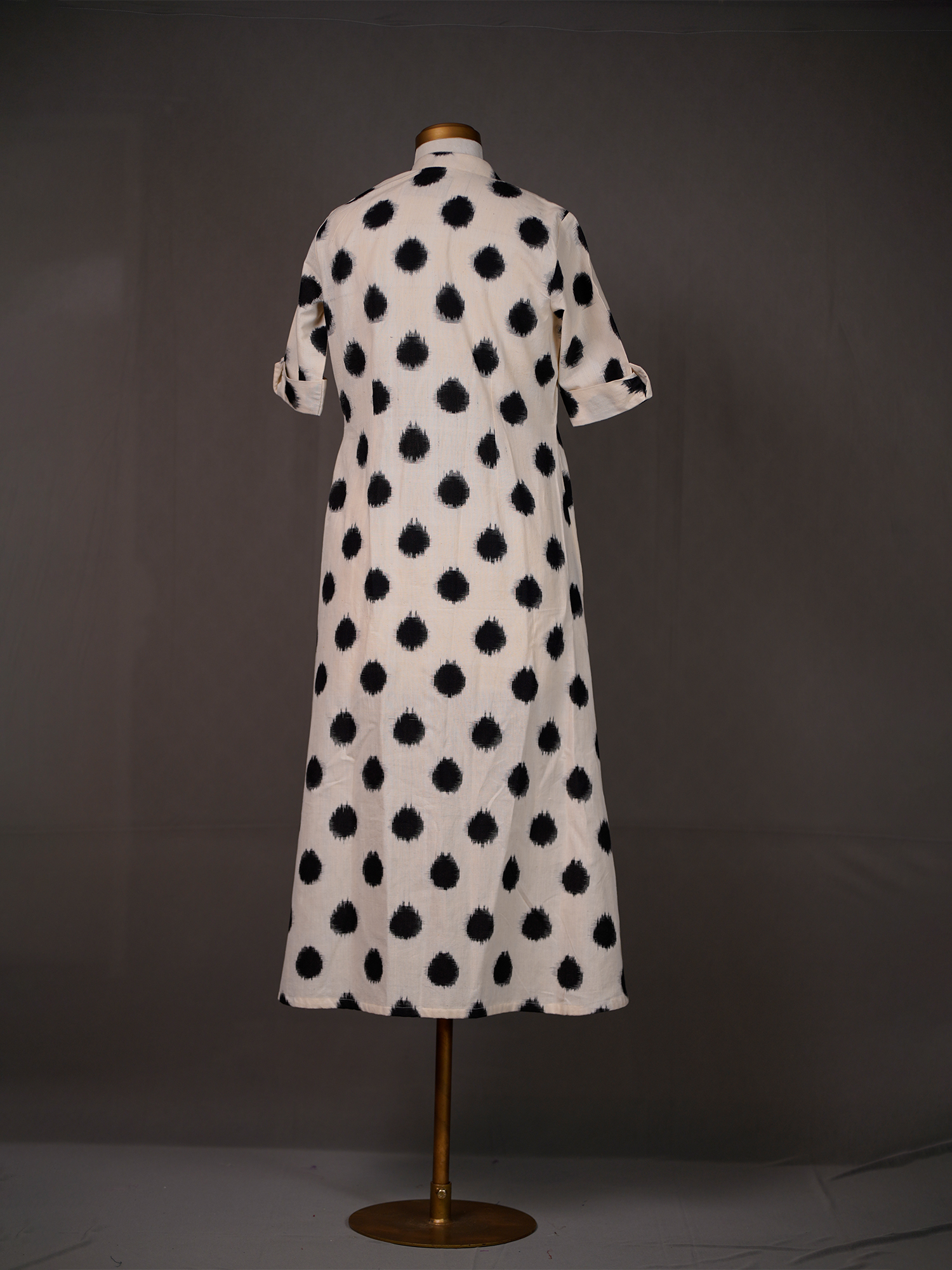 Off White Handwoven Cotton Ikkat Dress, Front Open with Buttons | Mamatha Tulluri