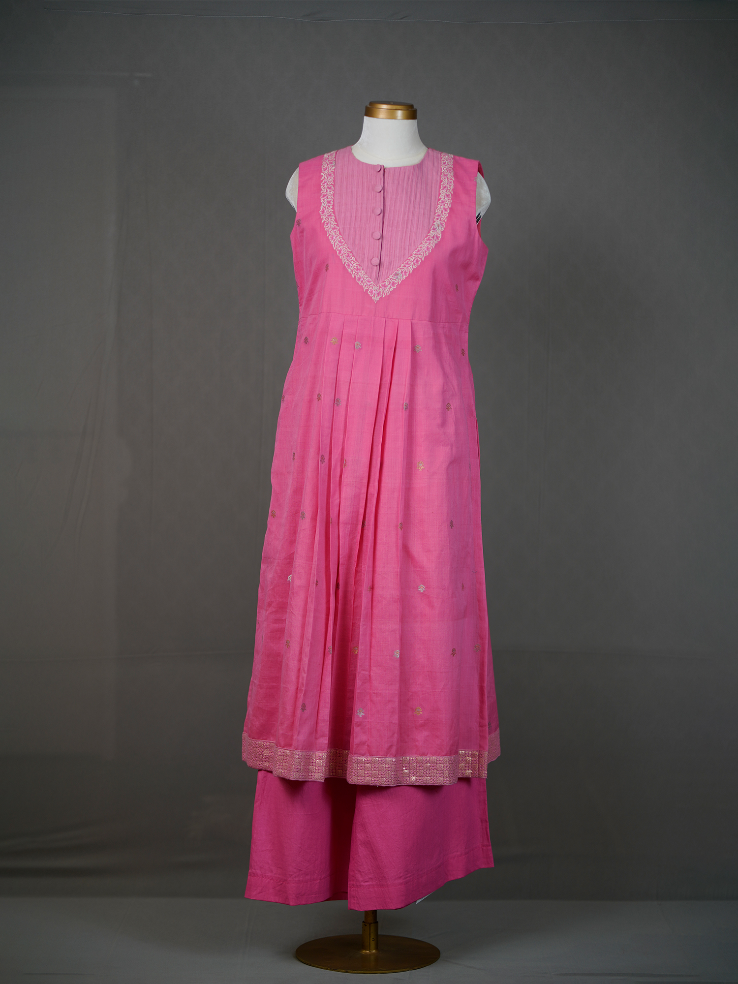 Pink Handwoven Sleeveless Kurti With Yoke, Zari Buttis And Pants