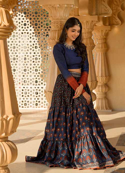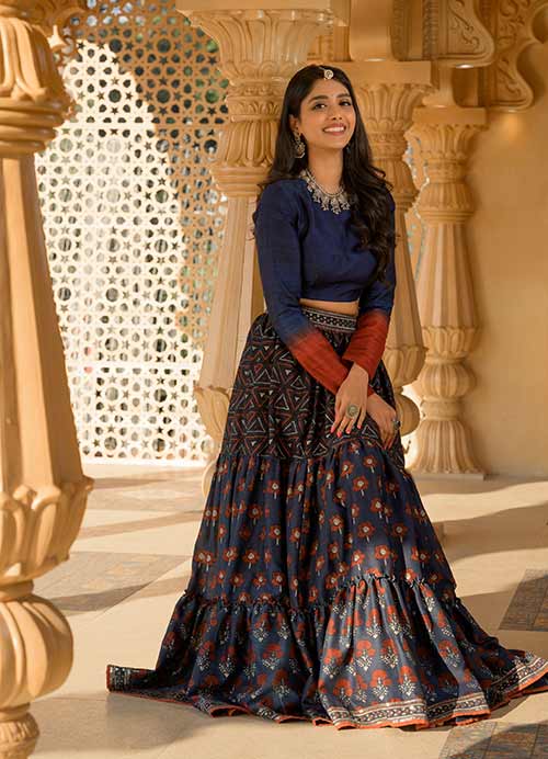 Dark Blue Chanderi Ajrakh Print Lehenga with Raw Silk Blouse | Mamatha Tulluri