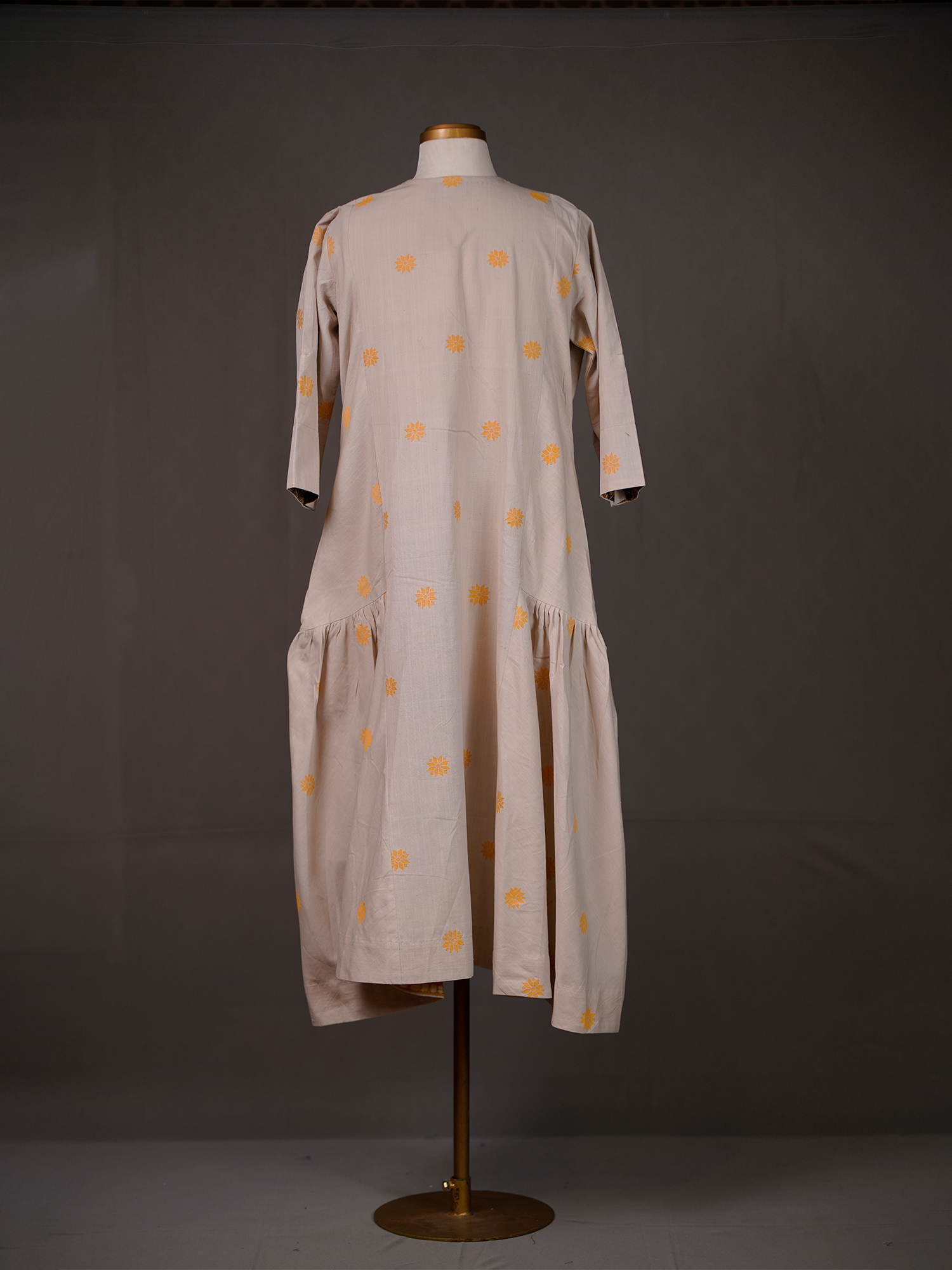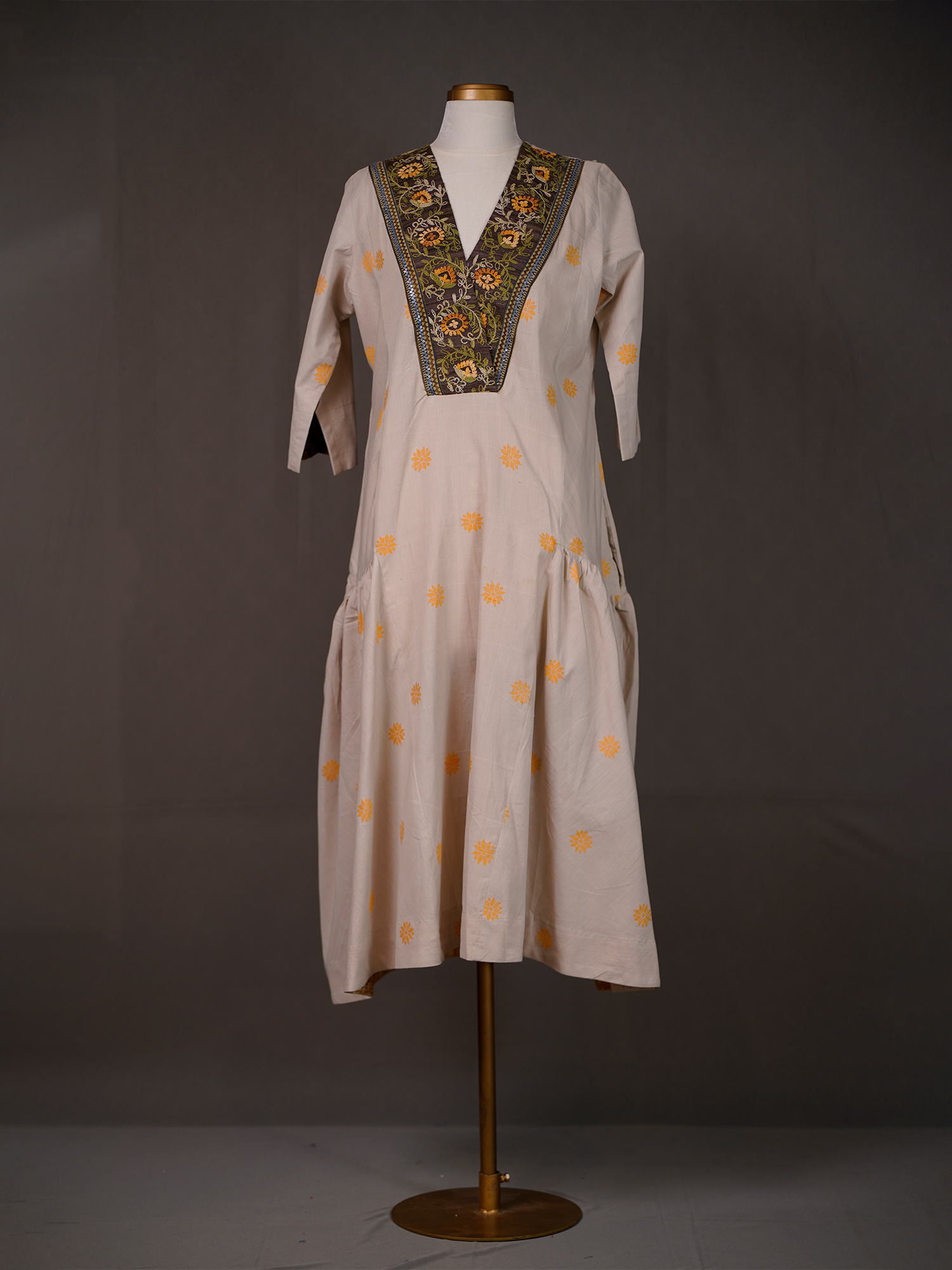 Beige Dress with Side Gathers, Buttis and Thread Work on V Neck