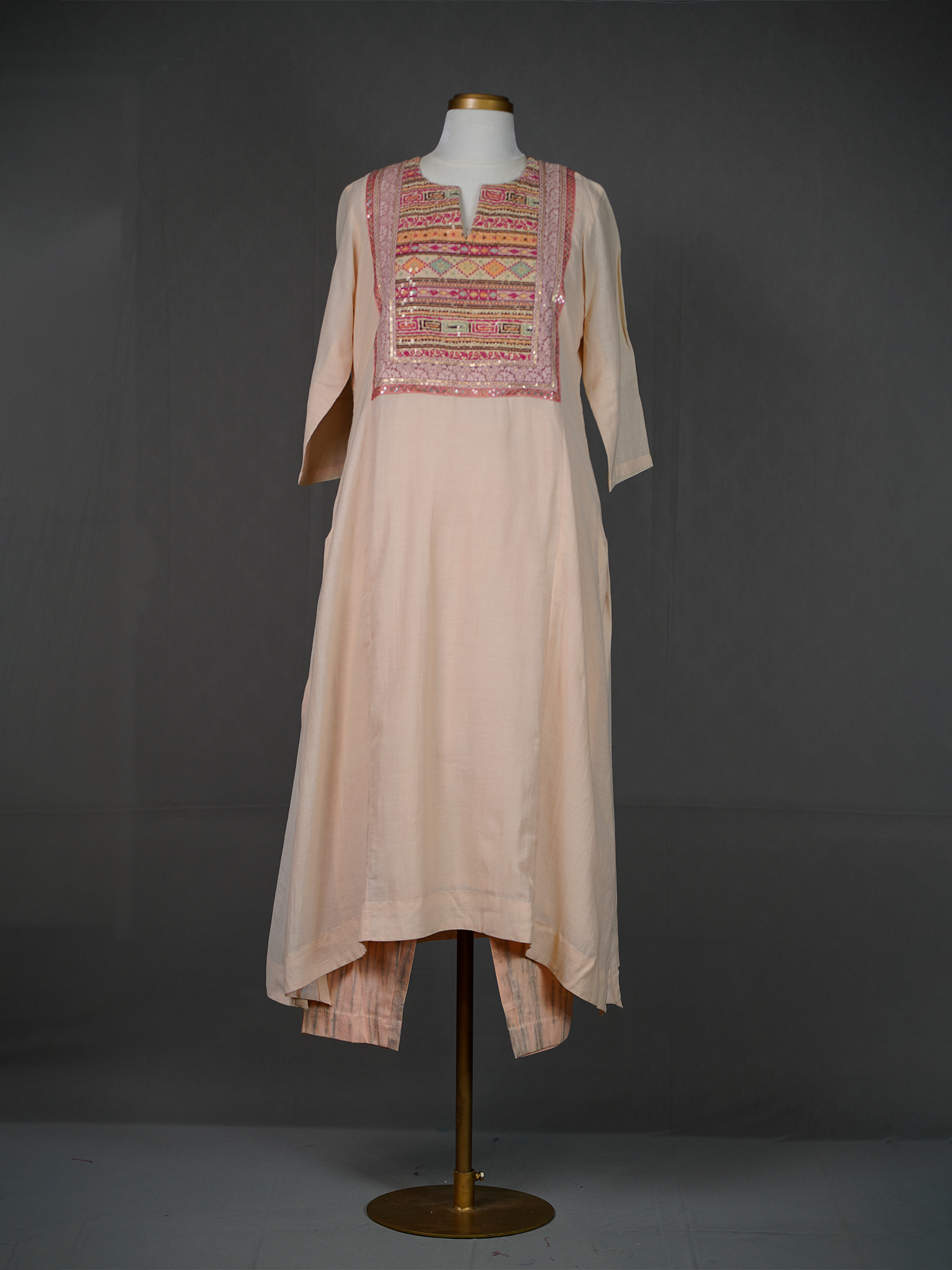 • Onion Pink Handwoven Kurti With Kutch Work and Pintuck Bodice
