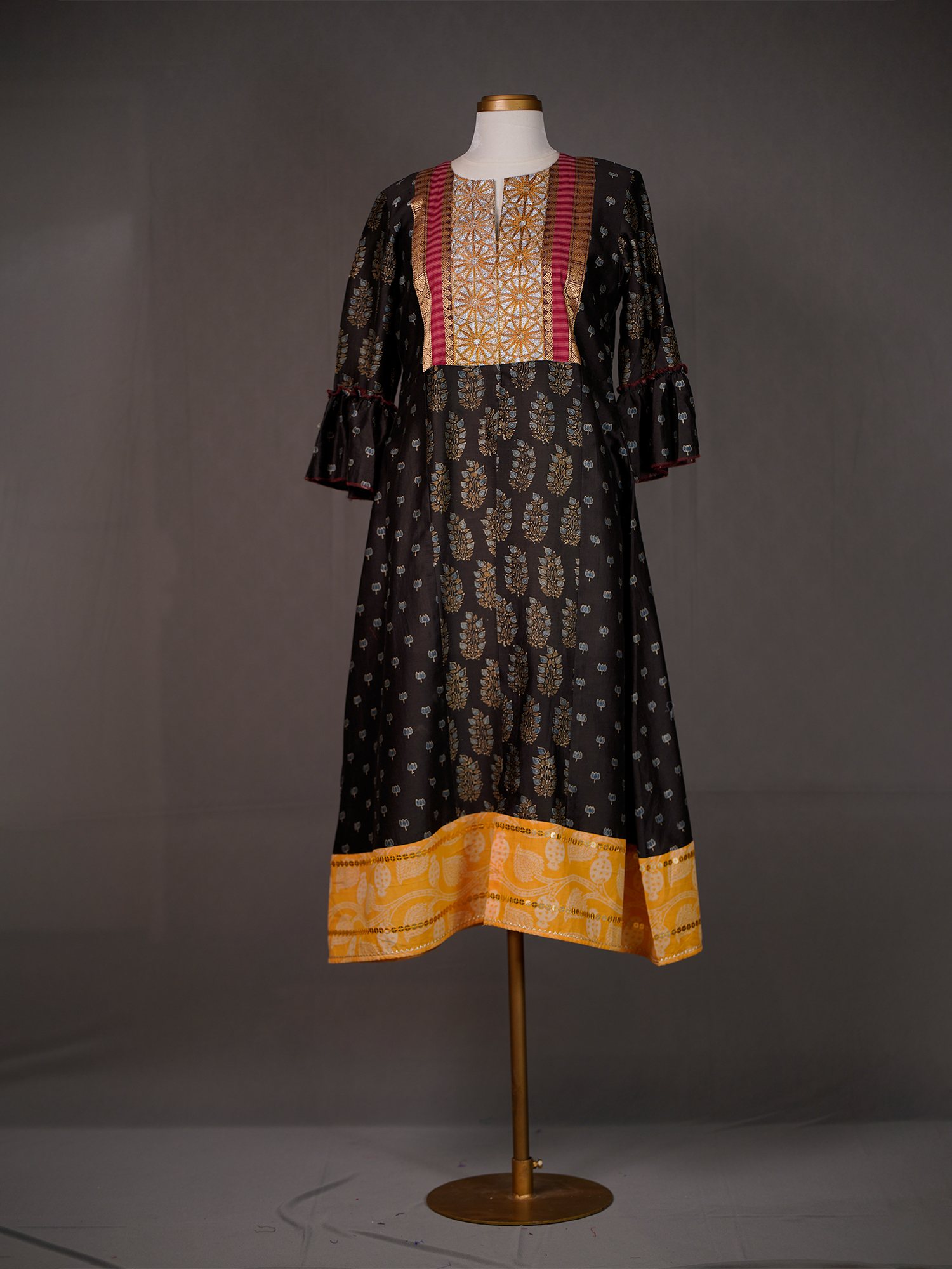 Black Chanderi Kurti with Ajrakh Print Panel and Thread Work Yoke