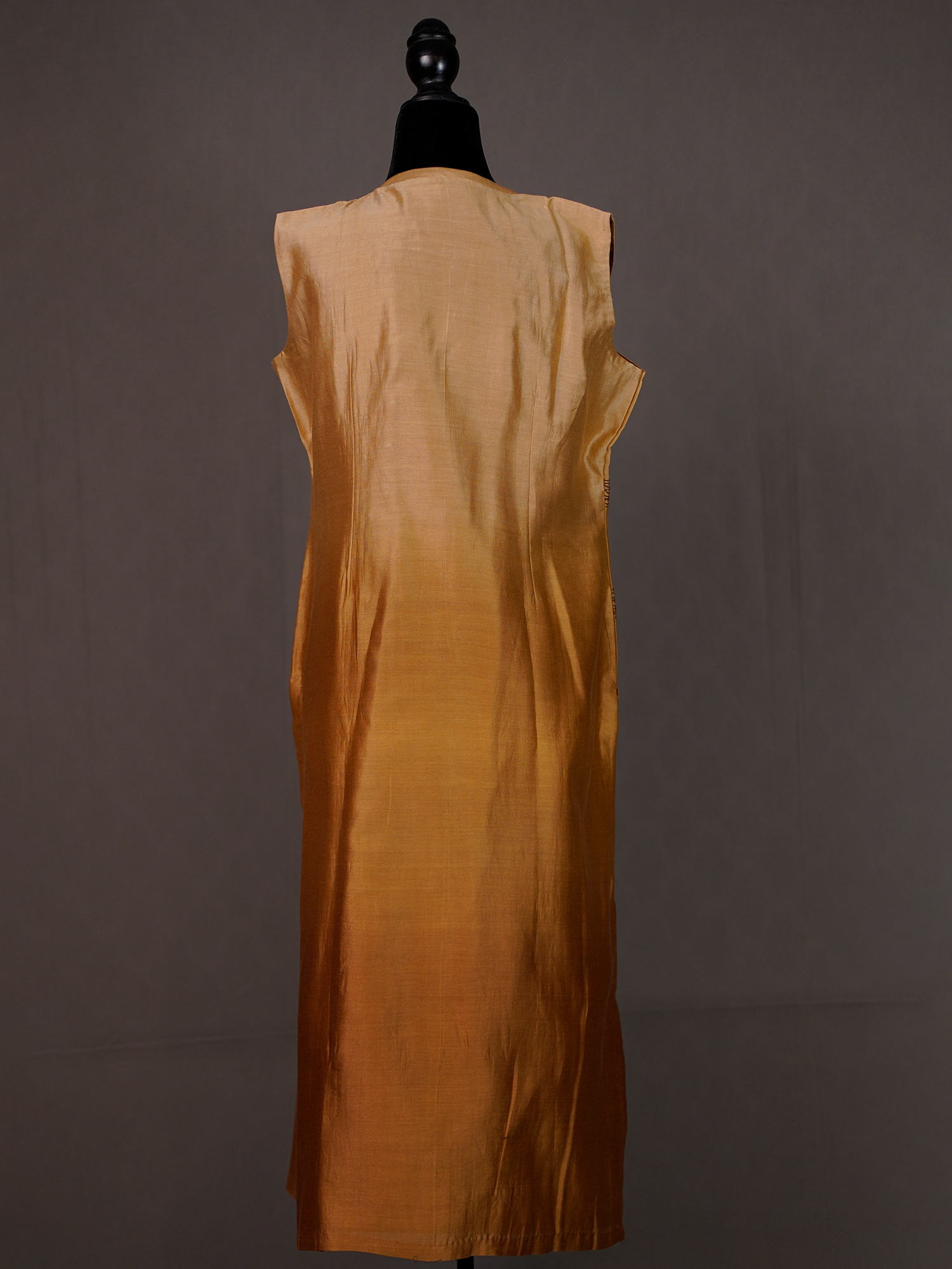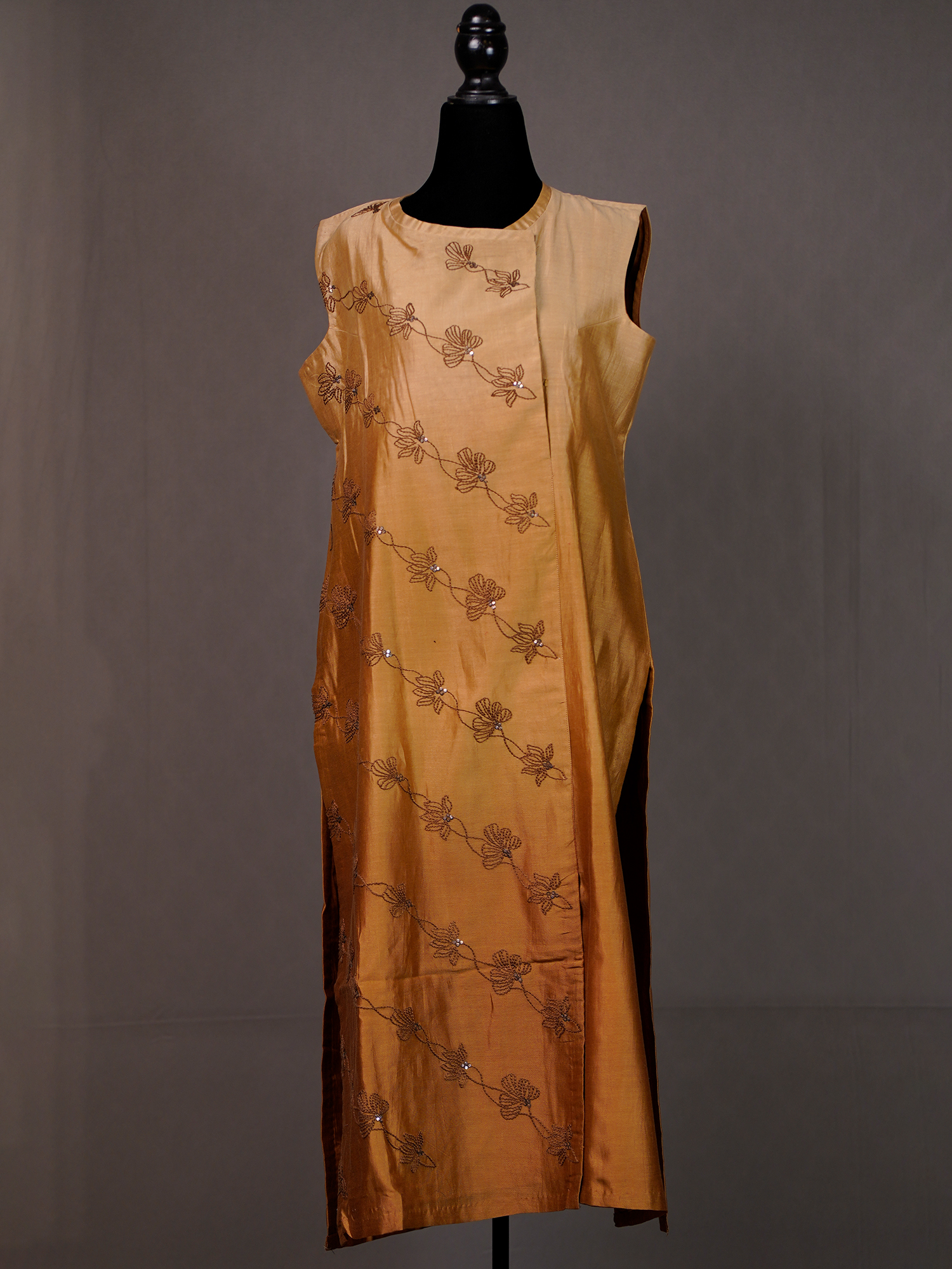 Brown Shaded Sleeveless Overlapping Chanderi Kurti With Thread Work