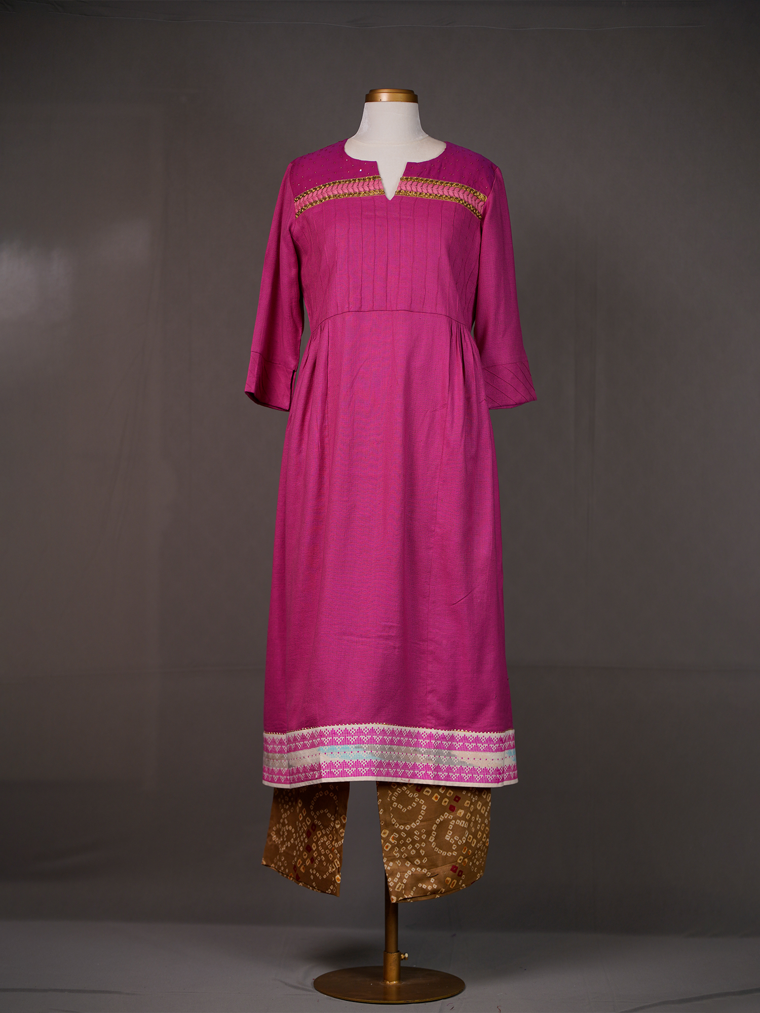 • Onion Pink Handwoven Kurti With Kutch Work and Pintuck Bodice