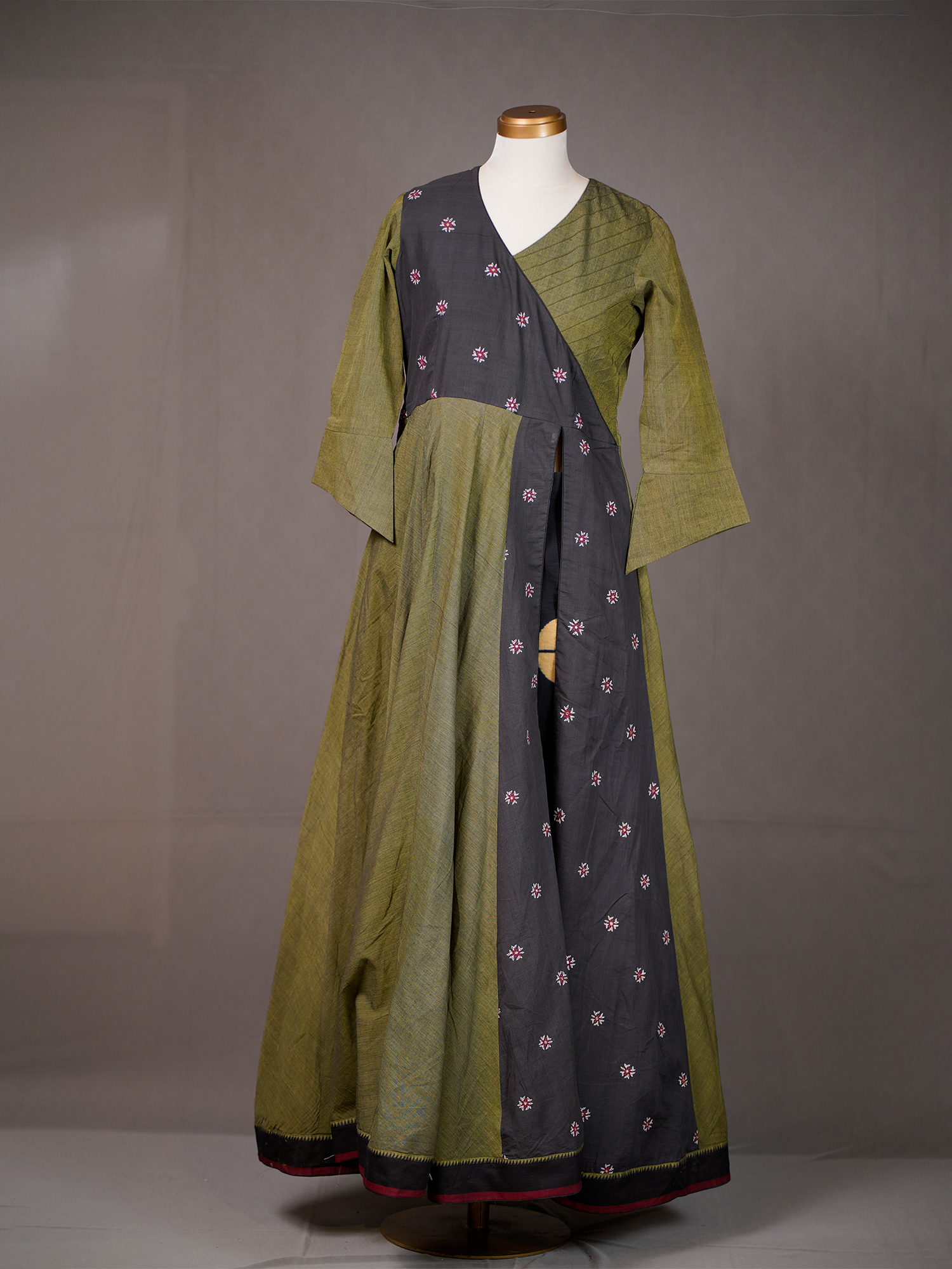 Green Cotton Kali Long Kurti with Black Work Panel, Tie-n-Dye Pants | Mamatha Tulluri