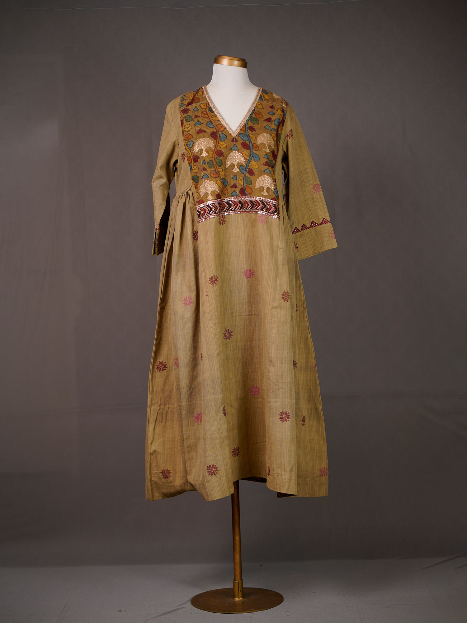 Green Handwoven Cotton Kurti, Side Pleats, Kalamkari Sequinned Yoke | Mamatha Tulluri