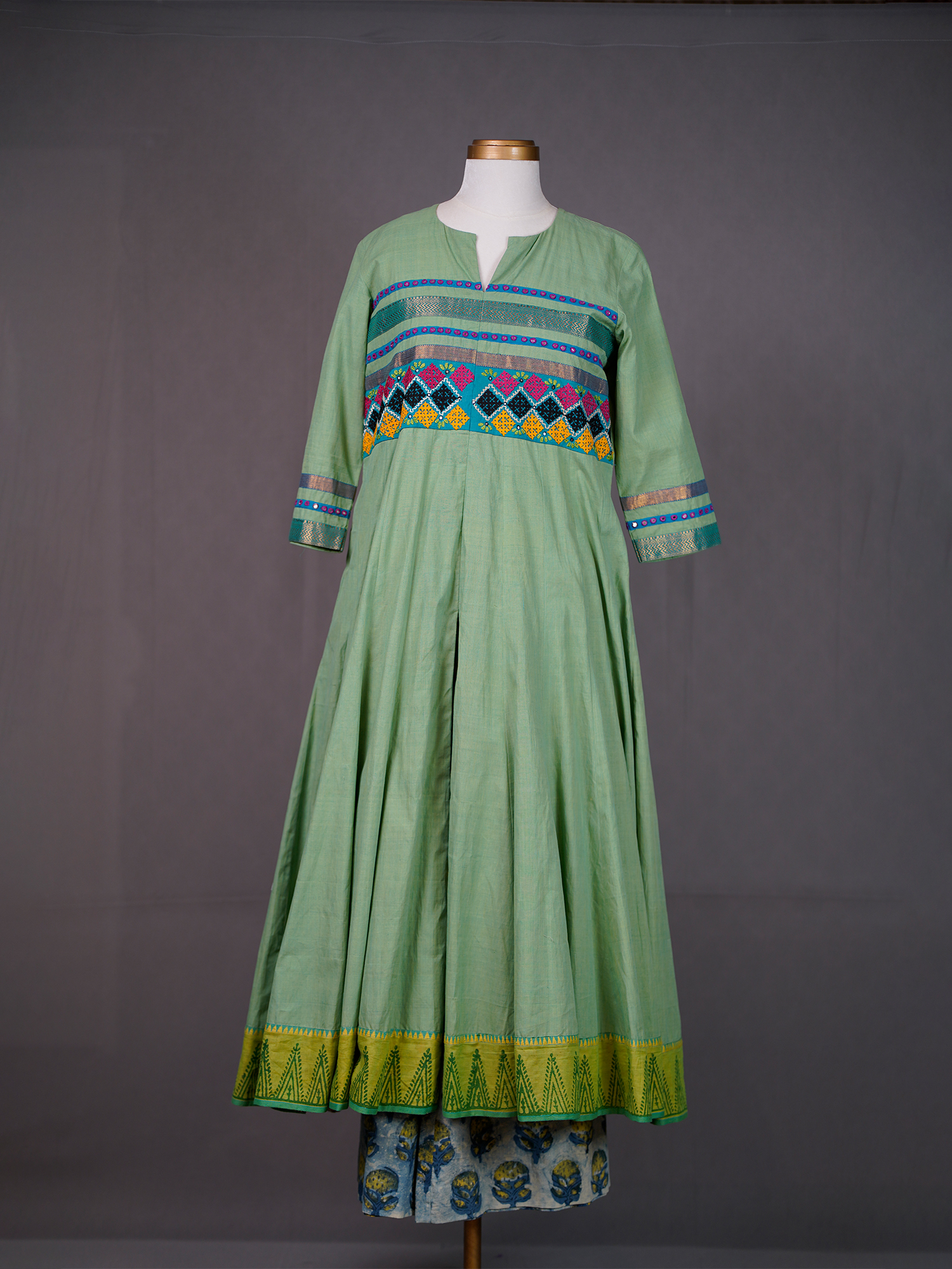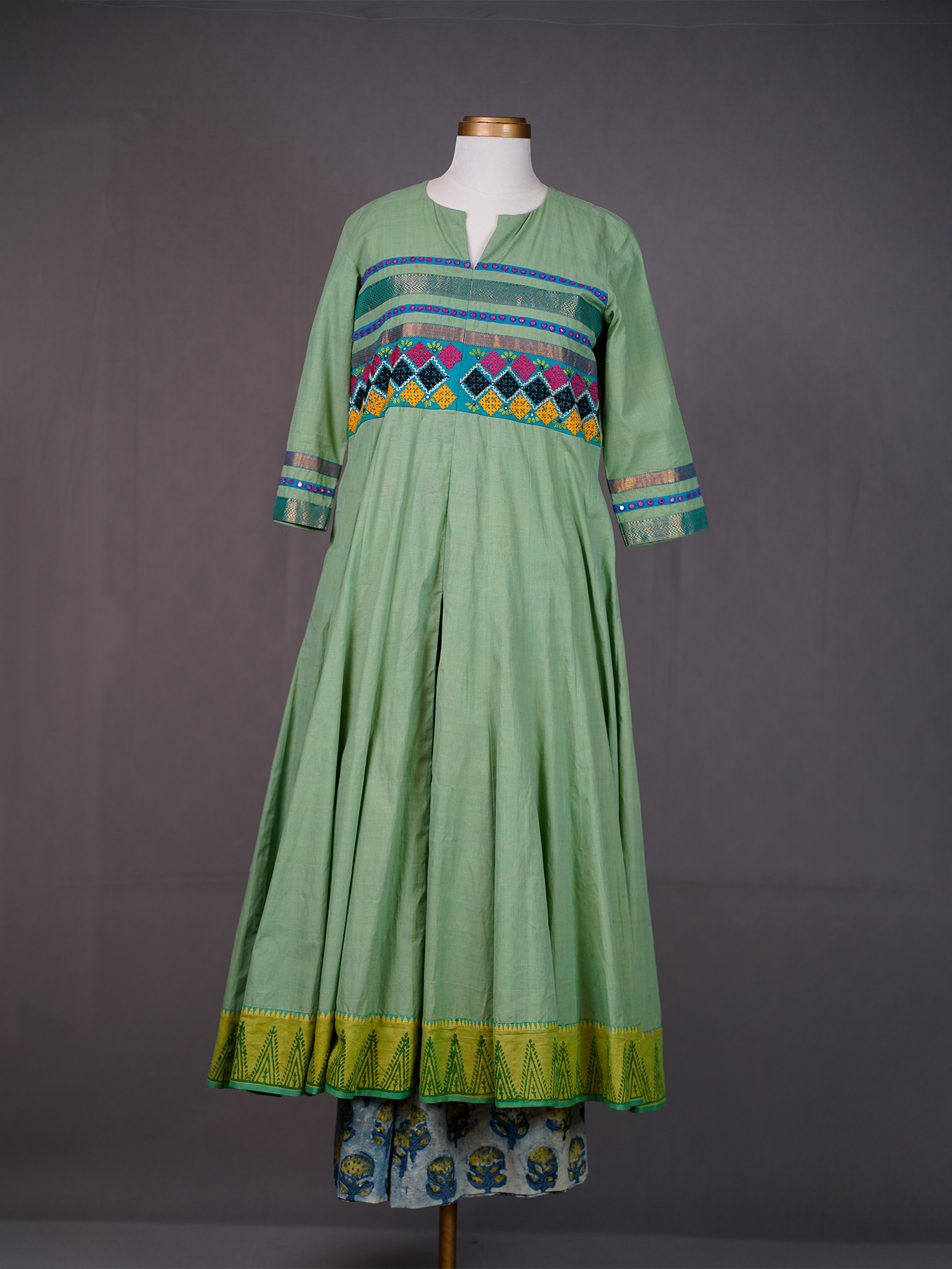 Green Kali Kurti with Kutch work, Mirrors, Front Slit, Printed Pants | Mamatha Tulluri