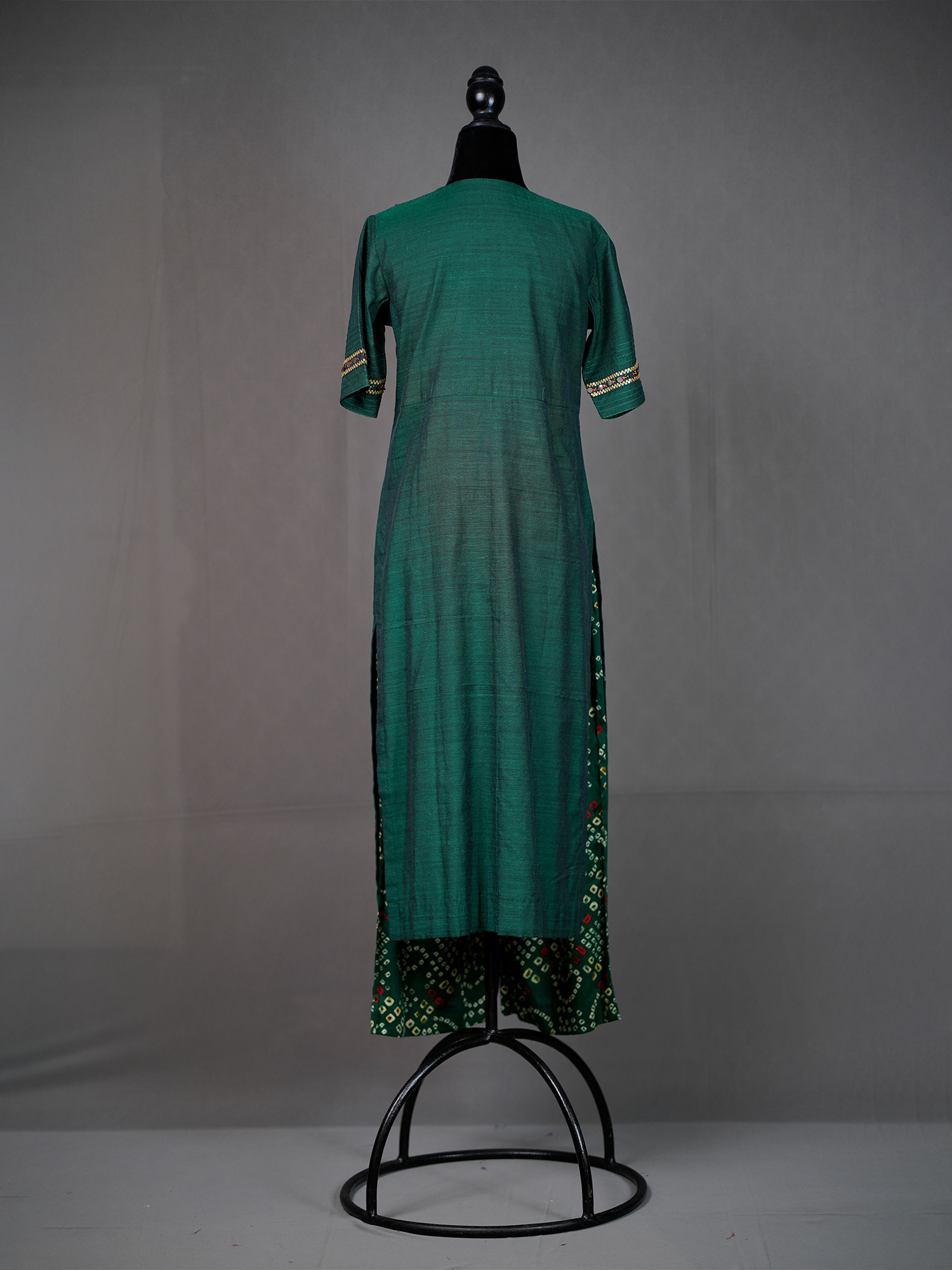 Green Kurti with Rich Sequinned Deep V Neck and Bandhni Pants