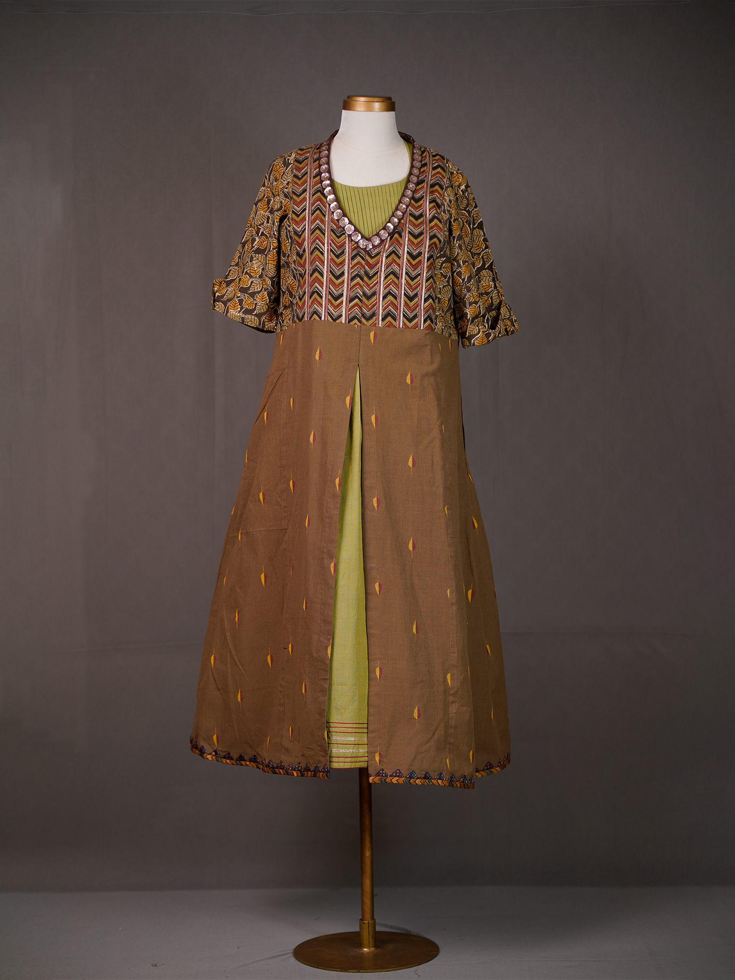 Green Sleeveless Cotton Handwoven A-Line Kurti With Kalamkari Koti