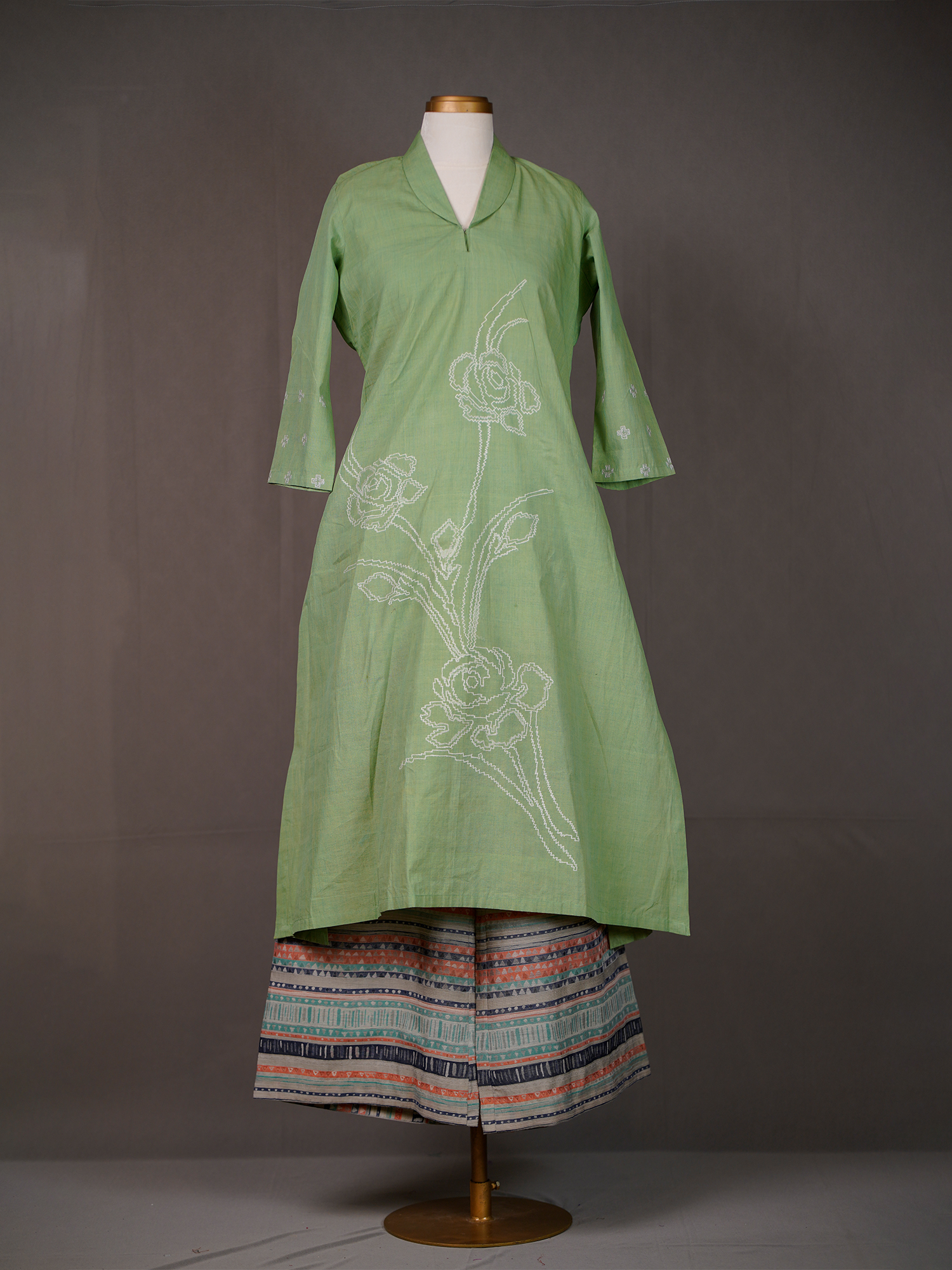 Light Green Cotton Kurti With Collar, Thread Work and Printed Pants | Mamatha Tulluri