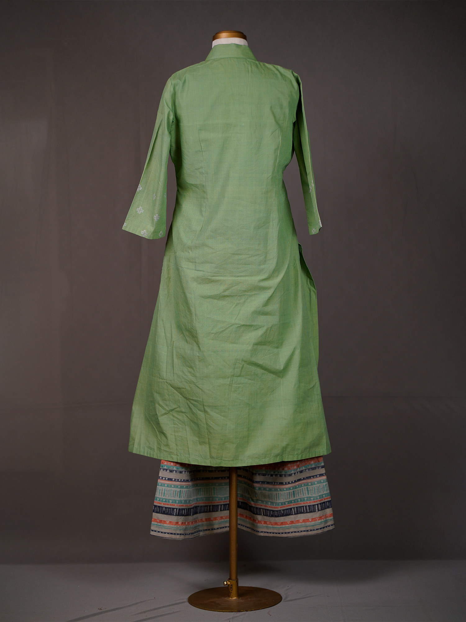 Light Green Cotton Kurti With Collar, Thread Work and Printed Pants