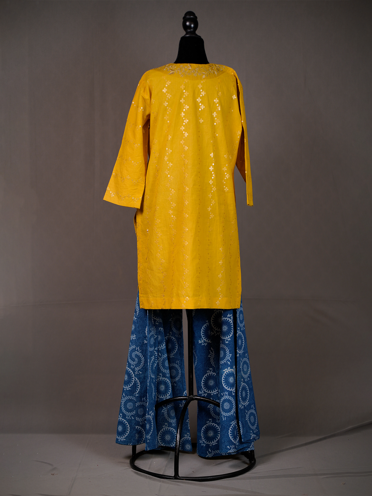 Mustard Cotton Short Kurti With Sequin Work and Blue Printed Pants