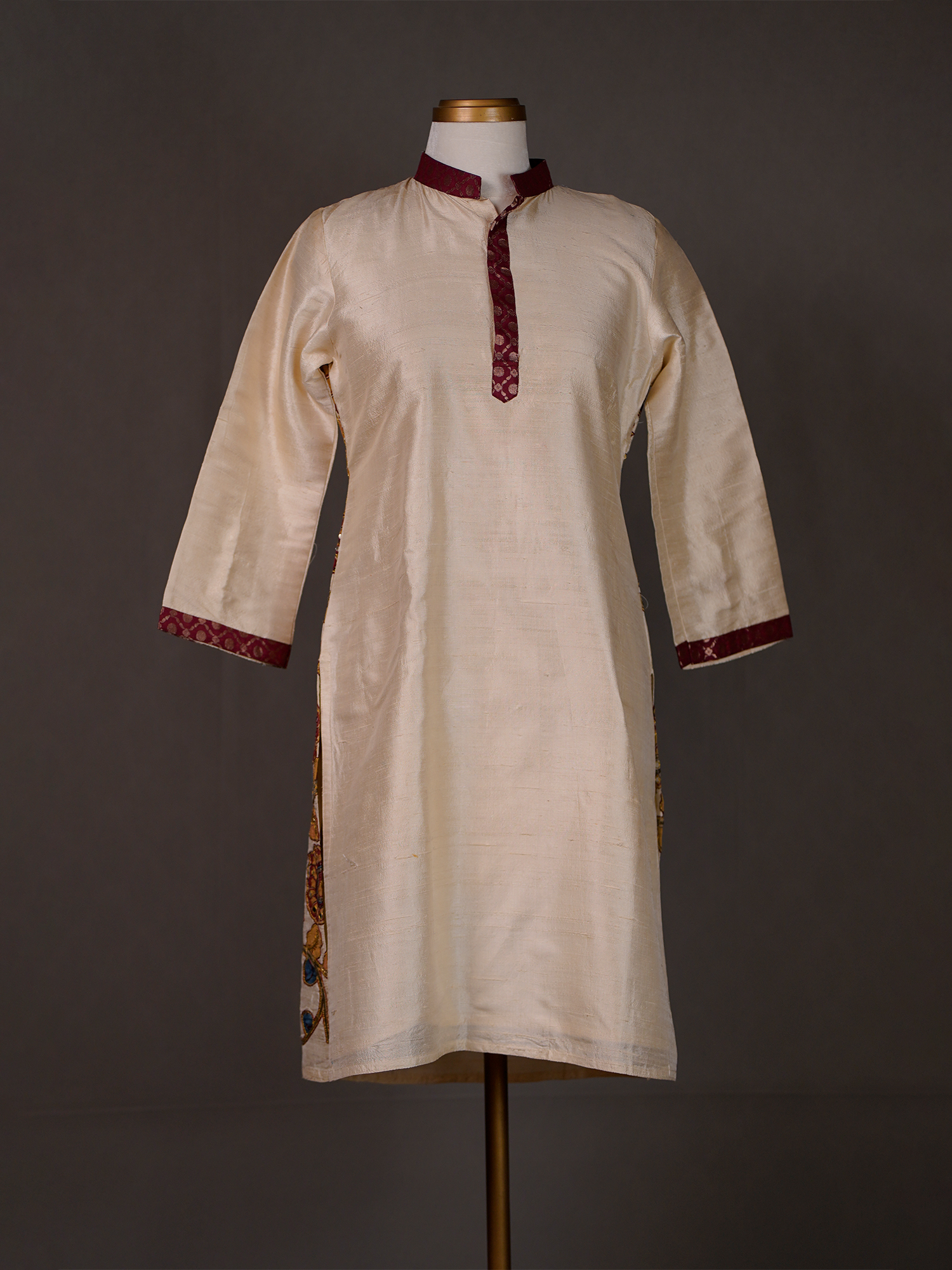 • Grey and White Handwoven Kurti With Ikkat Panels and Thread Work