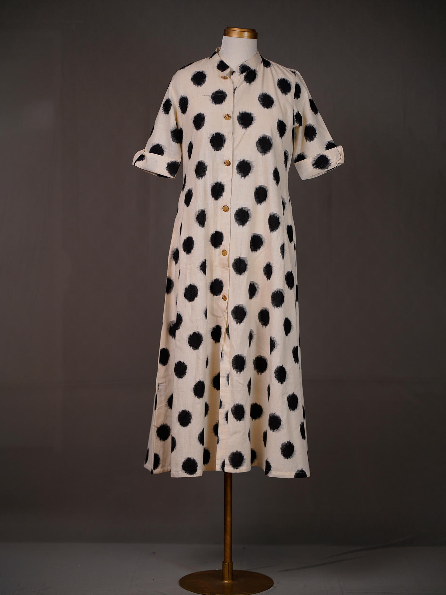 Off White Handwoven Cotton Ikkat Dress, Front Open with Buttons | Mamatha Tulluri