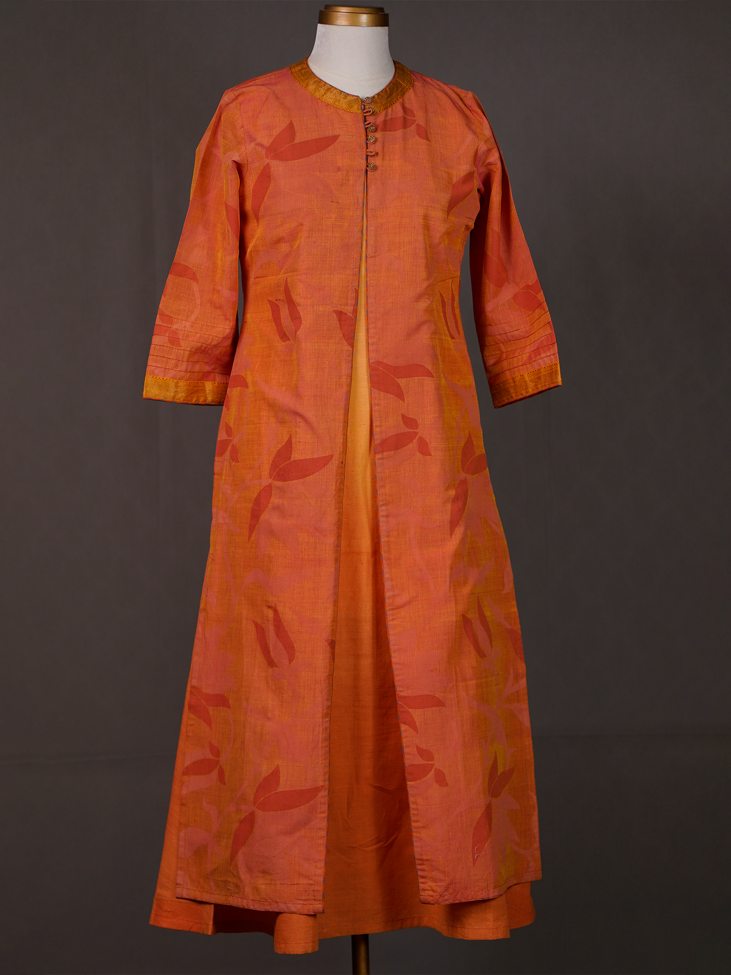 Orange Cotton Sleeveless Kurti Topped with Printed Front Open Koti | Mamatha Tulluri