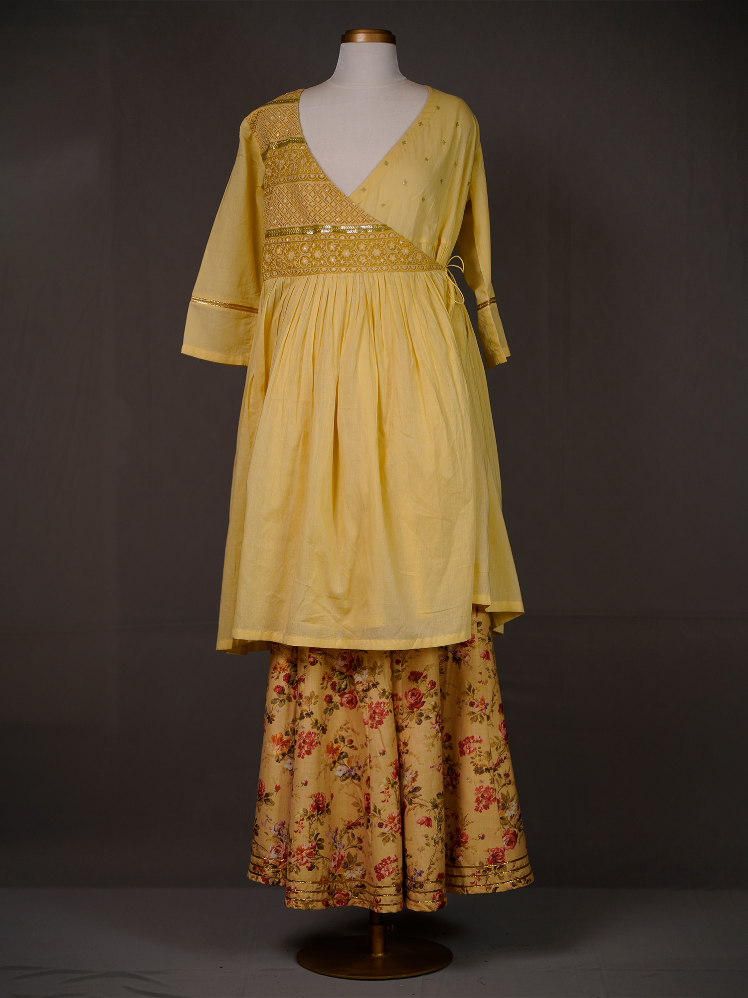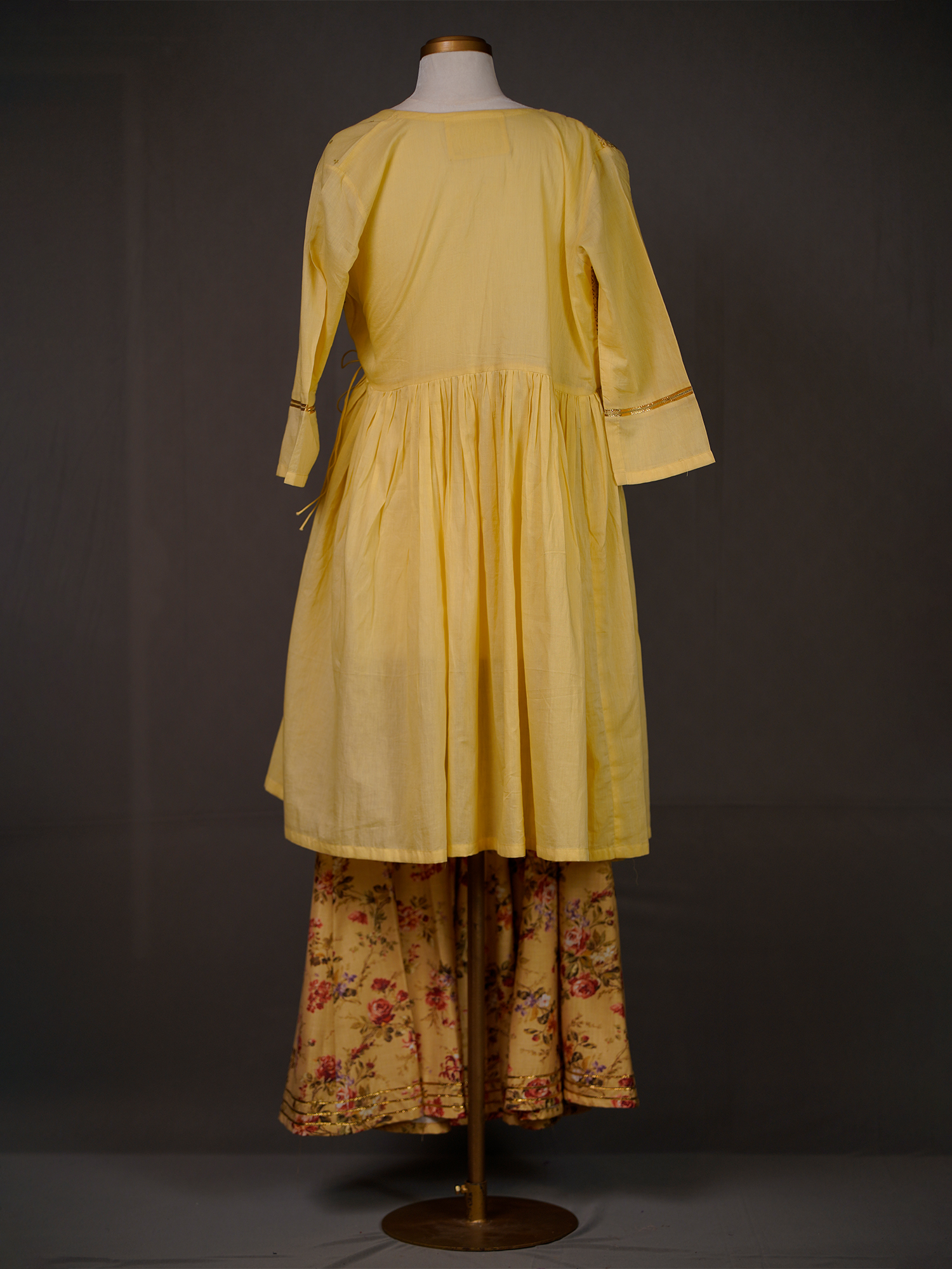 Yellow Cotton Overlapping Kurti With Work And Loose Printed Pants