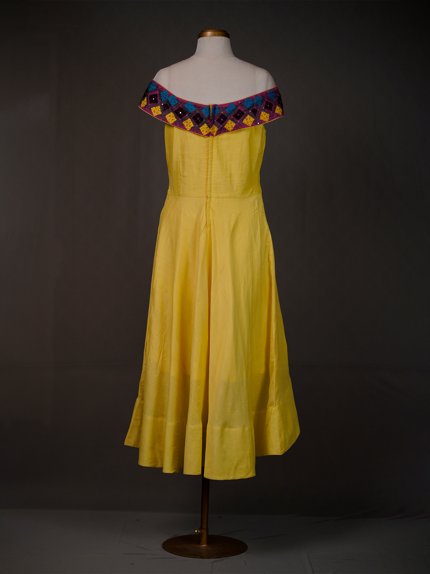 Yellow Off-Shoulder High-Low Dress with Striking Kutch Work Flap | Mamatha Tulluri