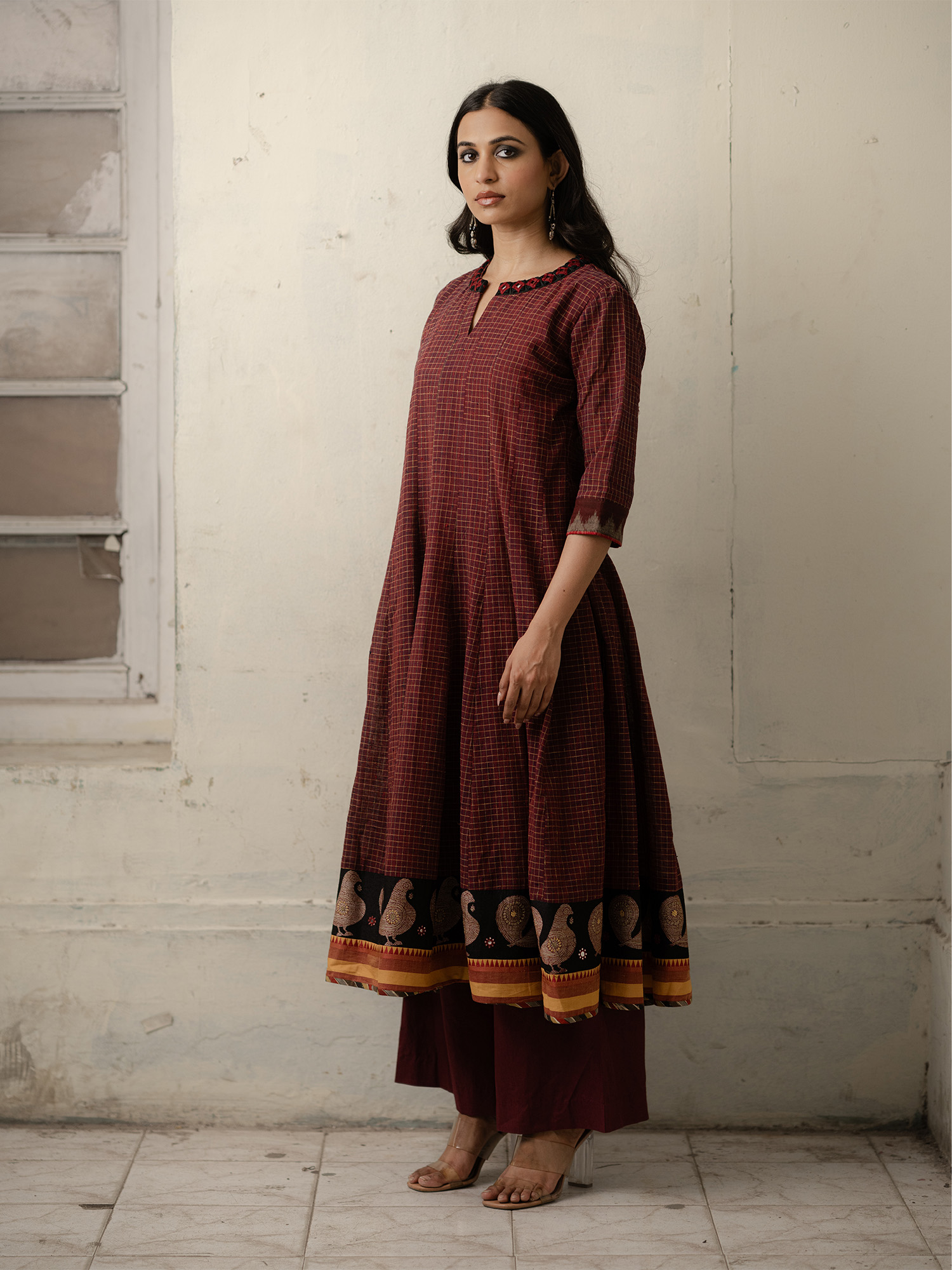 Maroon Checked Hand-Woven Cotton Kurti with Sequins, Mirrors with Pants