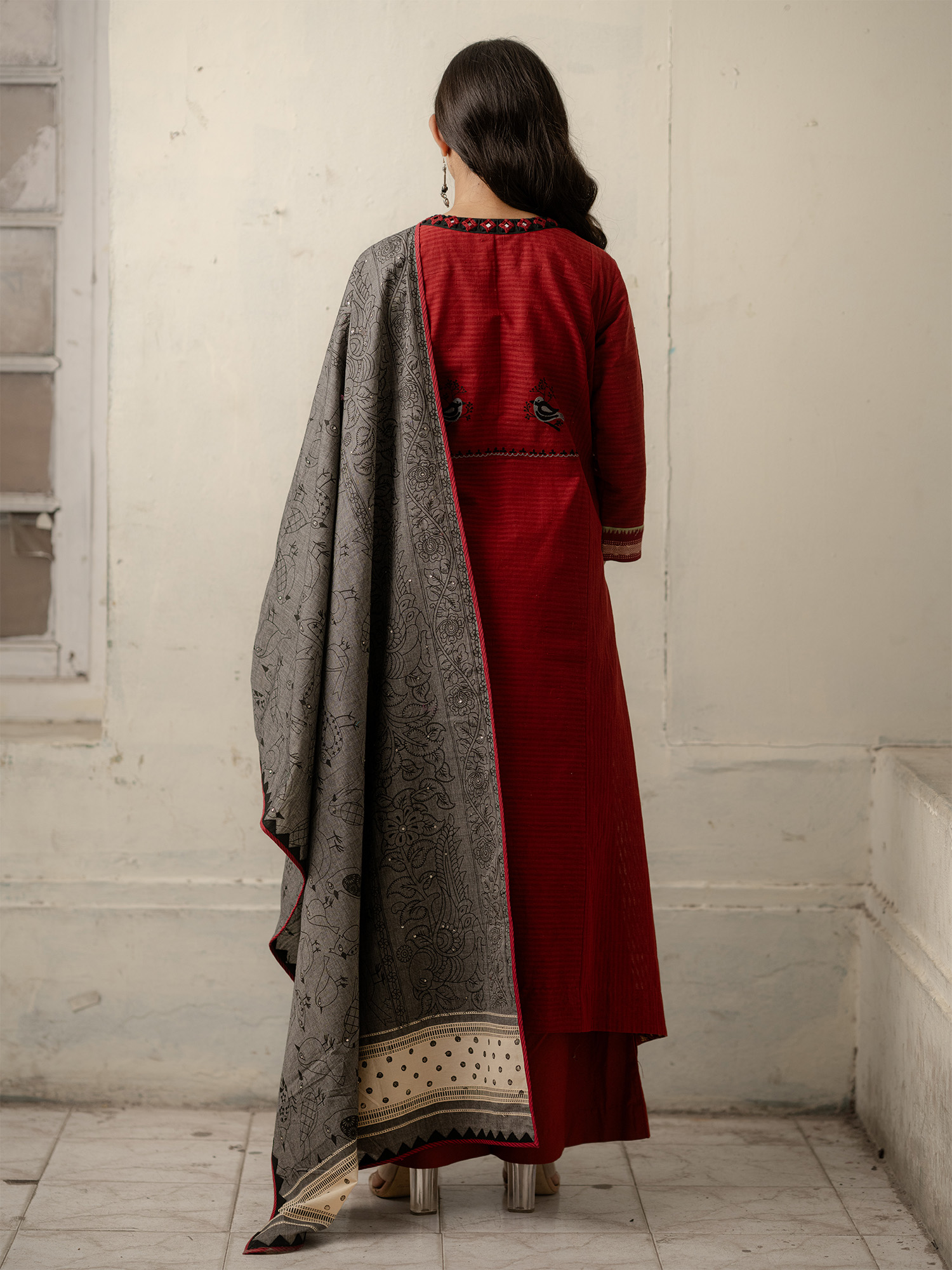 Maroon Hand-Woven Cotton Kurti with Mirror Embroidery and Sequinned Dupatta | Mamatha Tulluri